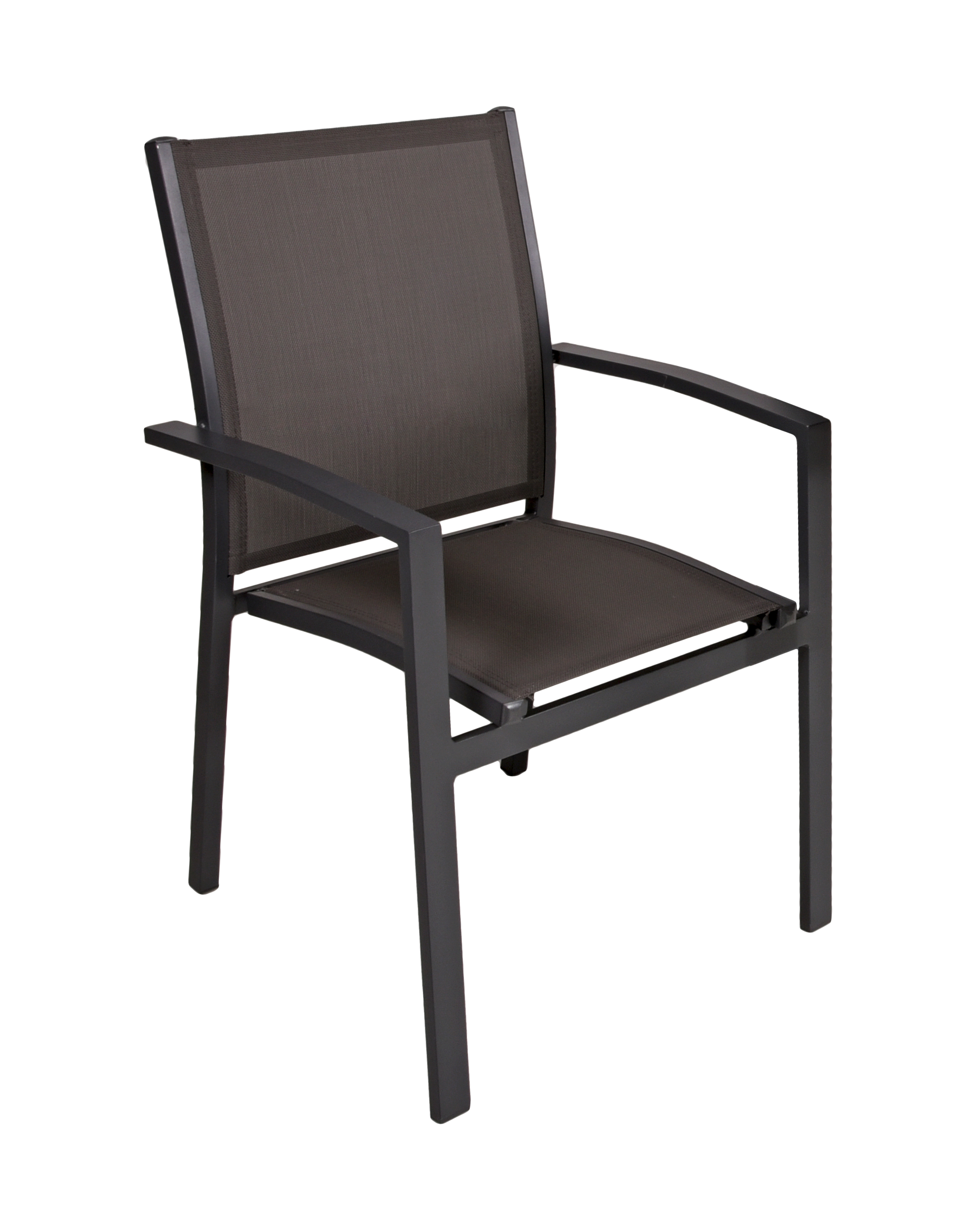 Die Stapelstühle ELENA sind aus Aluminium gefertigt und mit dunkelgrauem Kunststoffgewebe bespannt, was sie leicht und bequem macht.