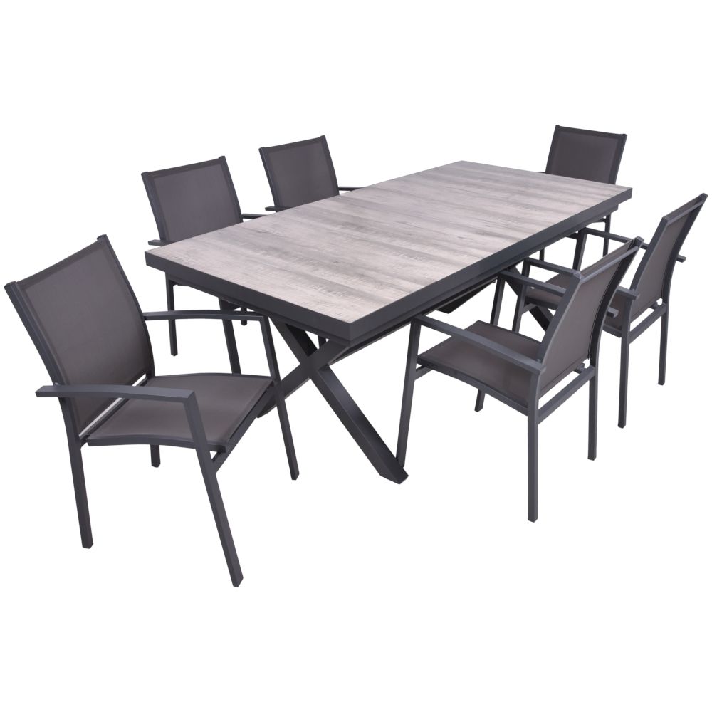 Alu / Keramik, Eiche-Optik / Kunststoffgewebe, 1 × Tisch 305445 | 6 × Stapelstuhl 305356