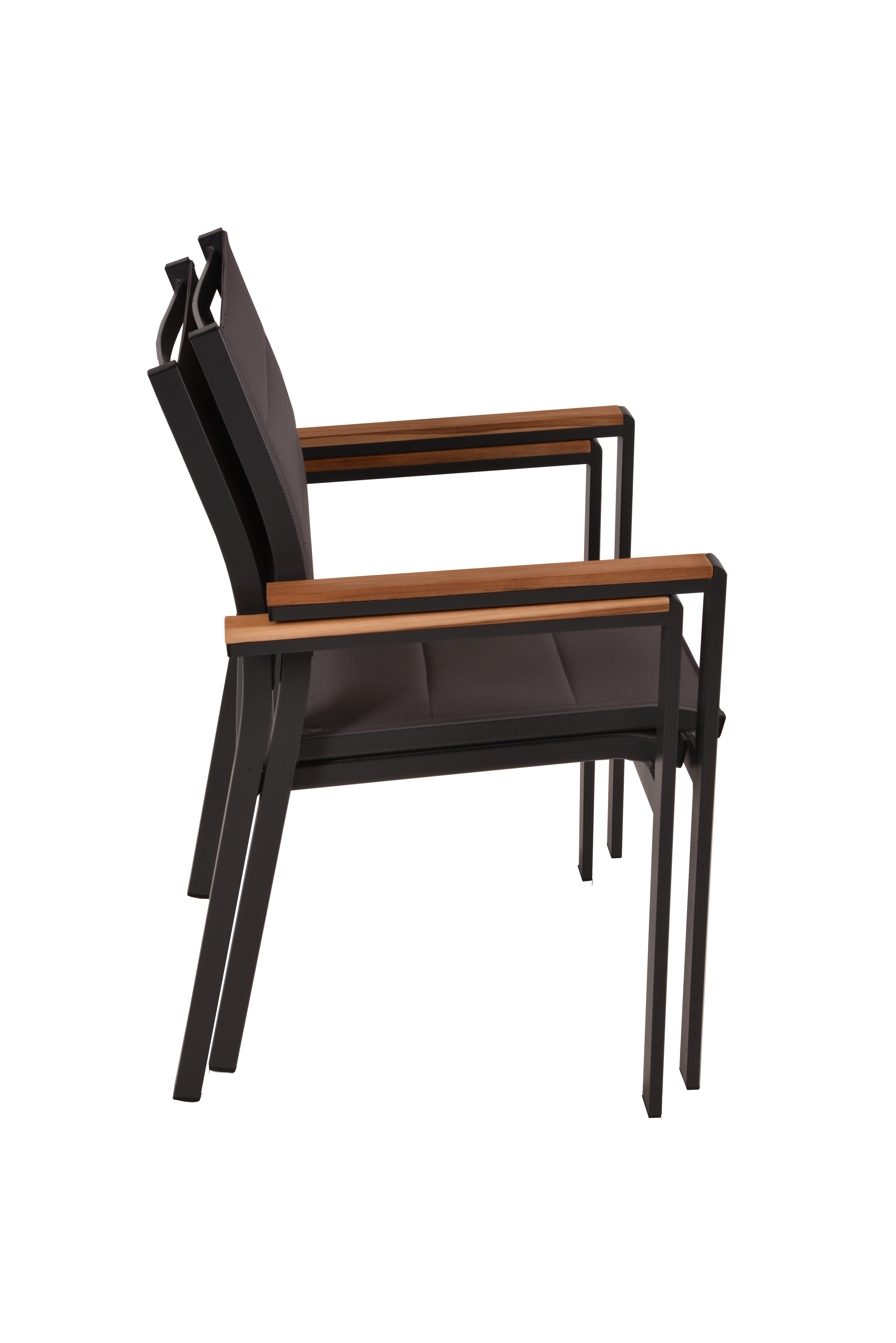 Die Stapelstühle DAVINA sind aus anthrazitfarbenem Aluminium gefertigt und verfügen über Sitzflächen und Rückenlehnen aus dunkelgrauem Kunststoffgewebe. Die Armlehnen sind aus Teakholz mit FSC-Zertifizierung und verleihen den Stühlen einen Hauch von Natürlichkeit und Komfort. Mit einem Tisch und sechs Stühlen ist dieses Set perfekt für gemütliche Mahlzeiten im Freien oder gesellige Zusammenkünfte mit Freunden und Familie.
