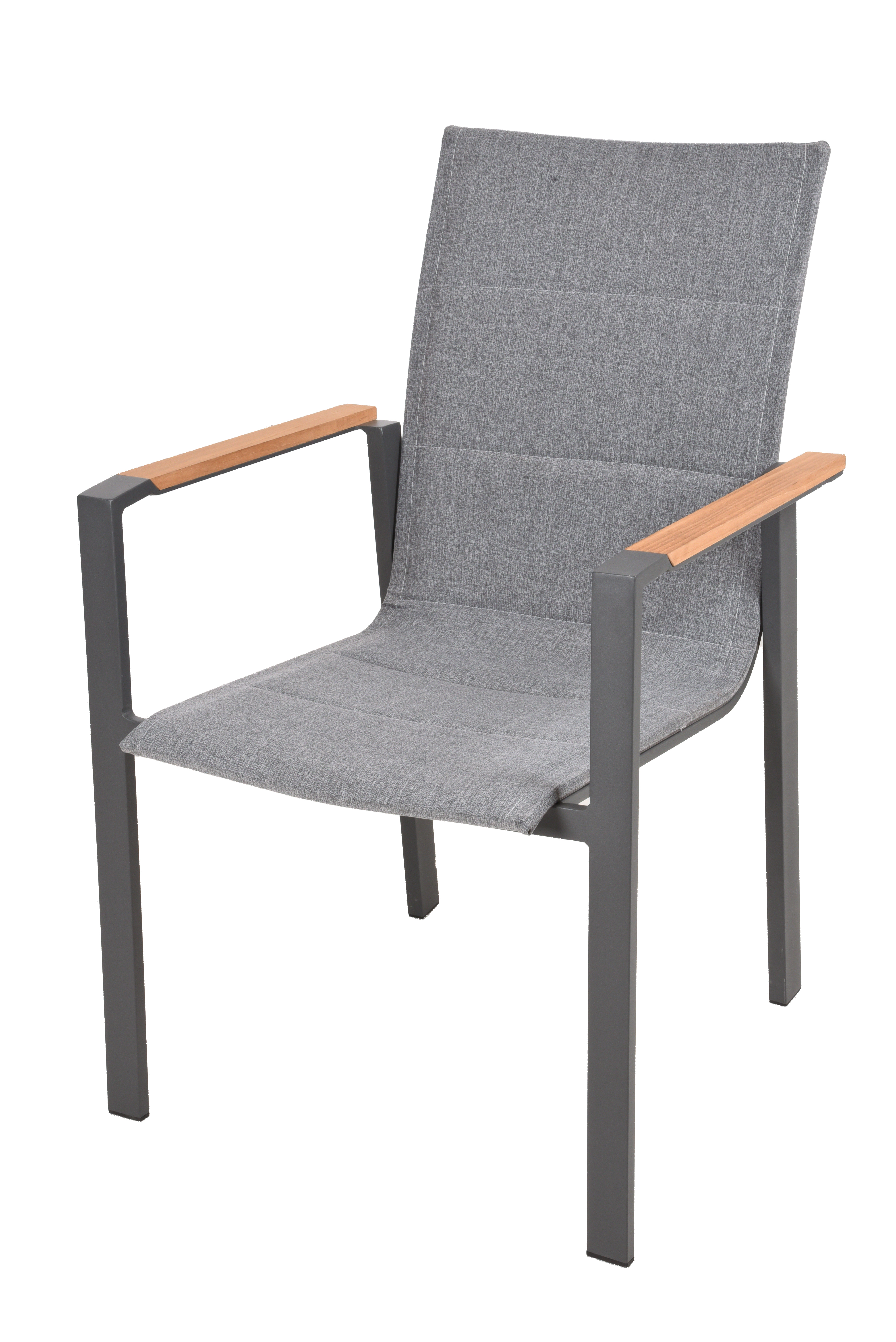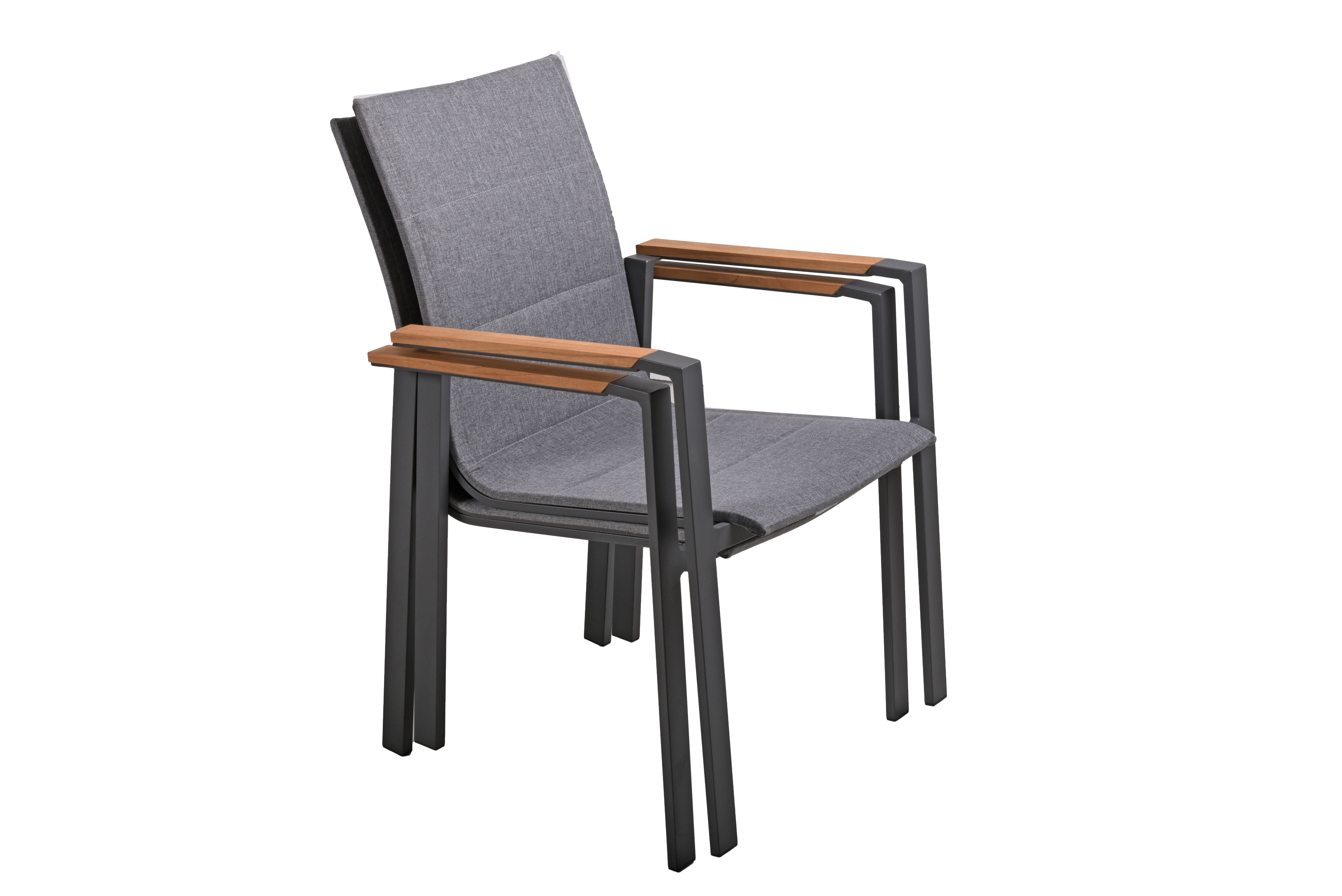 Die Stapelstühle DAVINA sind aus pulverbeschichtetem Anthrazit-Aluminium gefertigt und verfügen über Sitzflächen und Rückenlehnen aus dunkelgrauem Polyester sowie Teak-Armlehnen, die dem Set eine elegante Note verleihen.