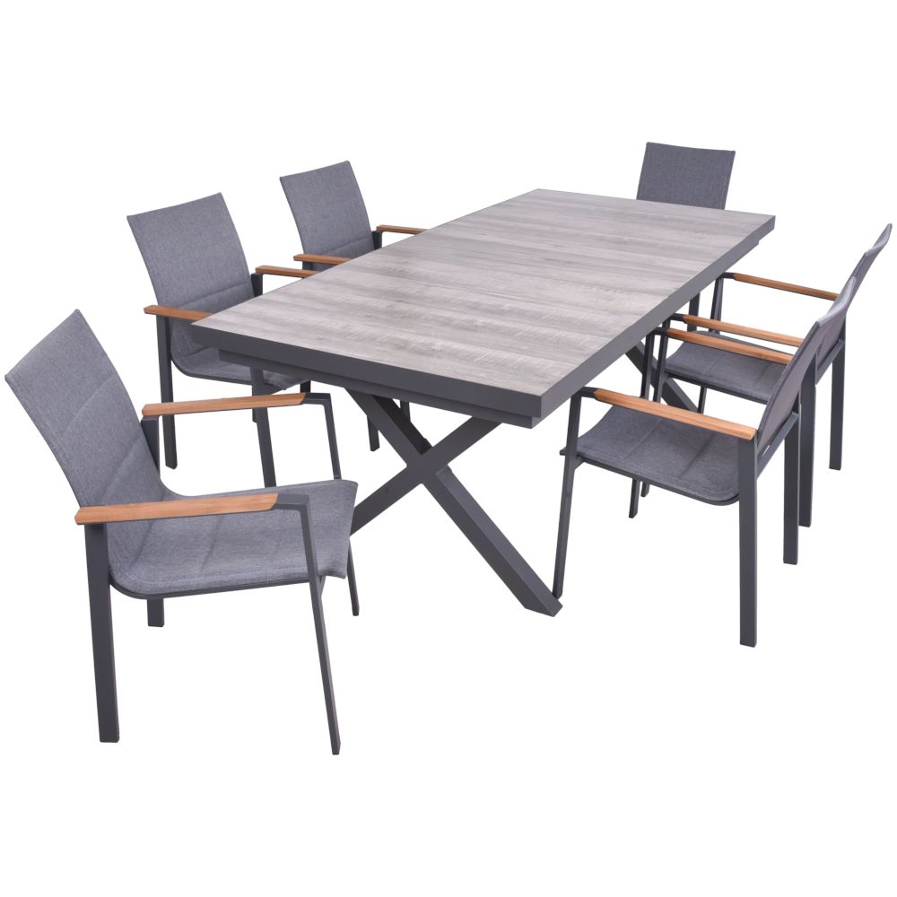 Alu / Keramik, Eiche-Optik / Kunststoffge / Teak FSC 100%, 1 × Tisch 305445 | 6 × Stapelstuhl 305398