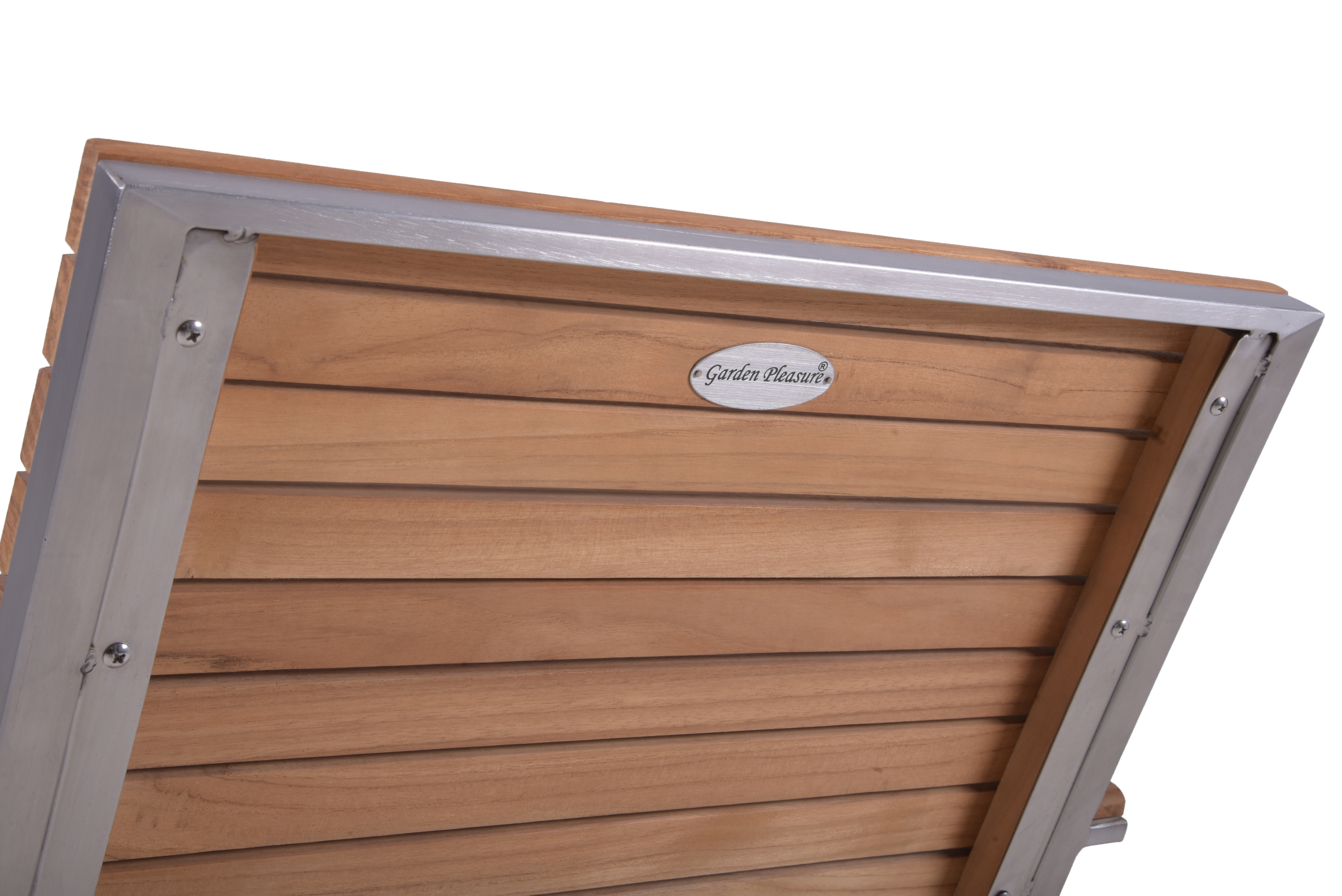 Hergestellt aus hochwertigem, gebürstetem Edelstahl 304 und FSC-zertifiziertem Teakholz in natürlicher, geölter Ausführung, kombiniert sie zeitlose Eleganz mit Robustheit.