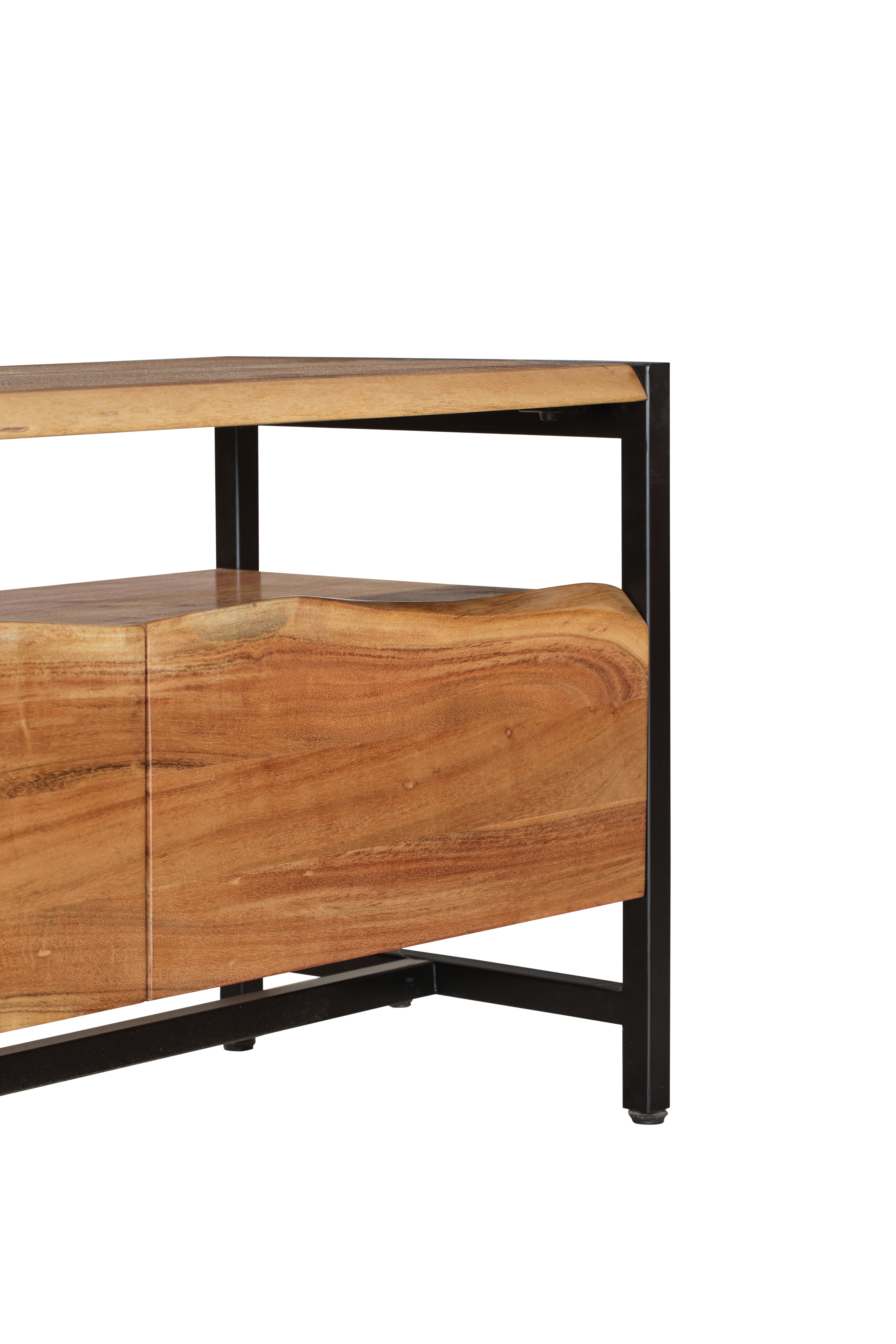Der TV-Schrank MALA besticht durch eine Kombination aus Akazienholz und pulverbeschichtetem Eisen. Die lackierte Holzoberfläche und die schwarze Metallstruktur verleihen dem Möbelstück eine moderne, industrielle Optik, die sich hervorragend in unterschiedliche Wohnstile integriert. Mit praktischen Ablageflächen bietet der Schrank ausreichend Stauraum für Ihre Elektronik und Zubehör.
