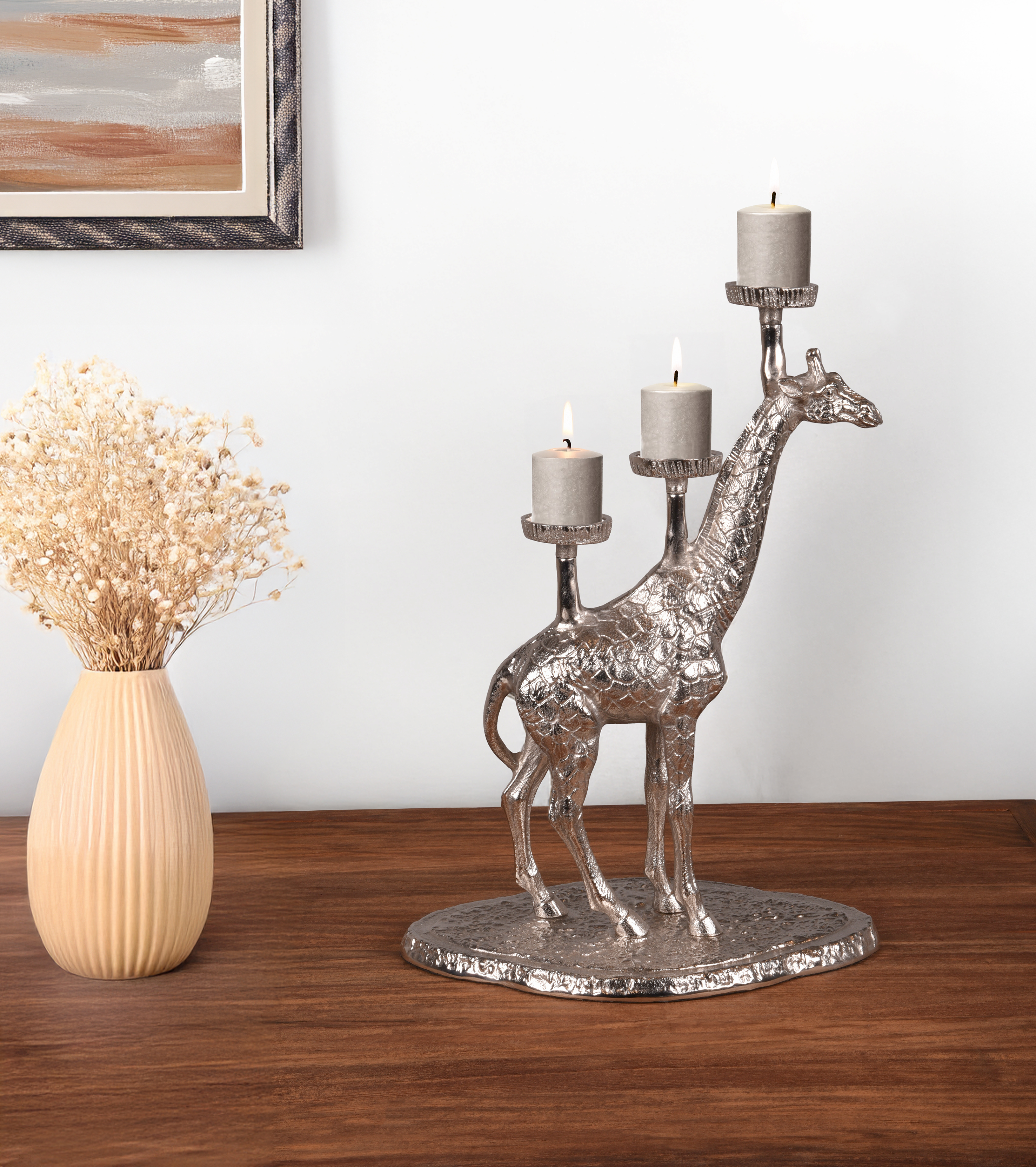 Der Kerzenhalter GIRAFFE aus Aluminium und Glas kombiniert elegante Materialien zu einem einzigartigen Dekorationsstück. Die außergewöhnliche Form einer Giraffe macht ihn zu einem auffälligen Blickfang, ideal für die Präsentation von Kerzen und das Setzen von stimmungsvollen Lichtakzenten. Perfekt für den Einsatz in Innenräumen, verleiht er jedem Raum eine besondere Atmosphäre.