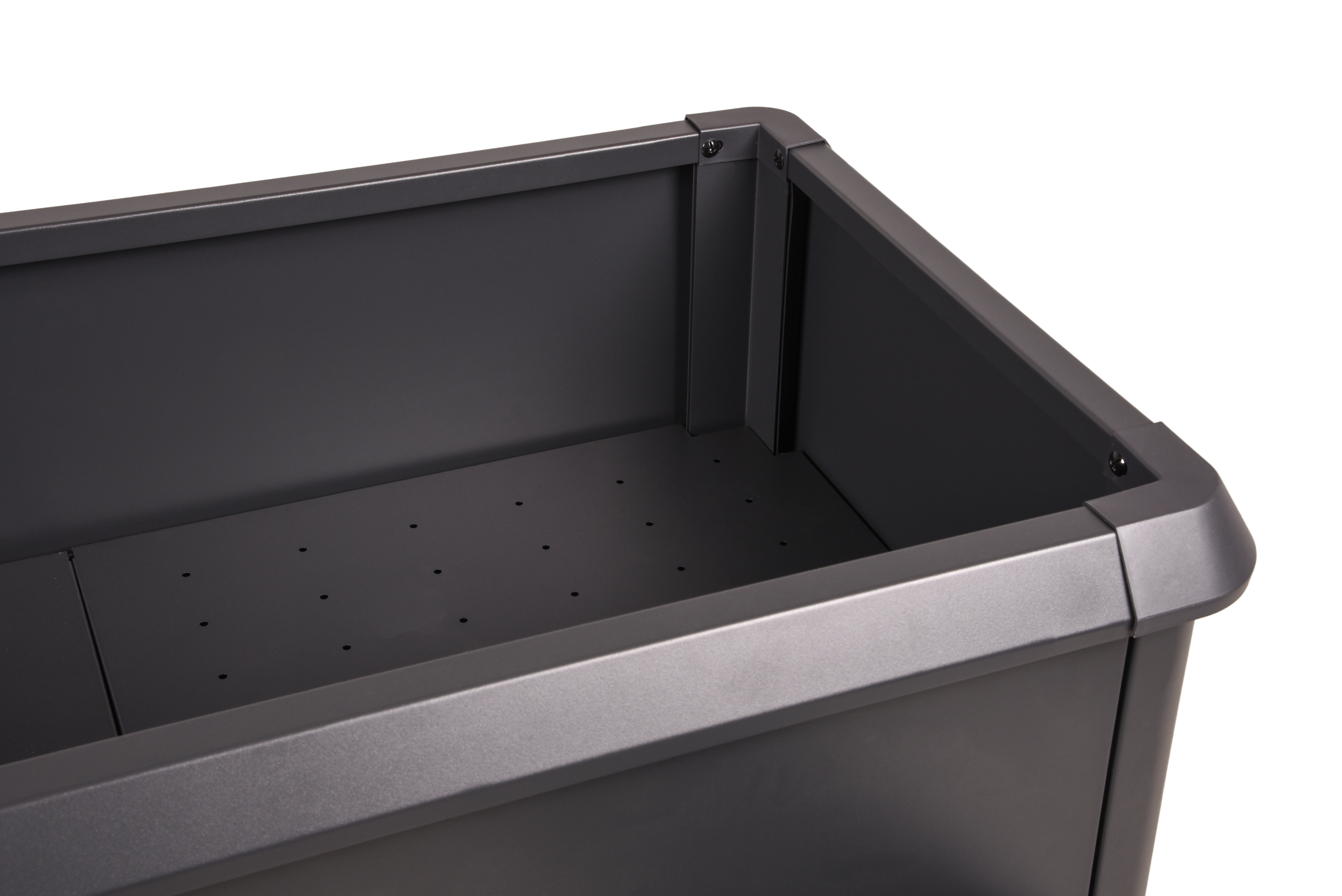 Mit dem Hochbeet ZINNIA bringen Sie stilvolle Gartenfreude auf Balkon, Terrasse oder in den Garten: Das anthrazitfarbene, galvanisierte und pulverbeschichtete Stahlbeet ist robust, wetterfest und misst 107 × 57 × 78 cm. Dank selbstbewässernder Pflanzschicht und schneckenabweisendem Rand gedeihen Kräuter, Gemüse und Blumen besonders komfortabel und geschützt. Überschüssiges Wasser kann über ein verschließbares Loch in der Bodenmitte ablaufen – der umschaltbare Abflussstopfen macht ZINNIA dabei sowohl für den Innen- als auch Außenbereich ideal. Unter der Pflanzfläche bietet der integrierte Schrank (Innenmaß 96 × 46,5 × 51 cm) mit verschließbarer Tür praktischen Stauraum für Erde, Werkzeug oder Gießkanne und trägt bis zu 35 kg. So ist ZINNIA die clevere All-in-one-Lösung für alle, die bequem, sauber und mit modernem Look gärtnern möchten.