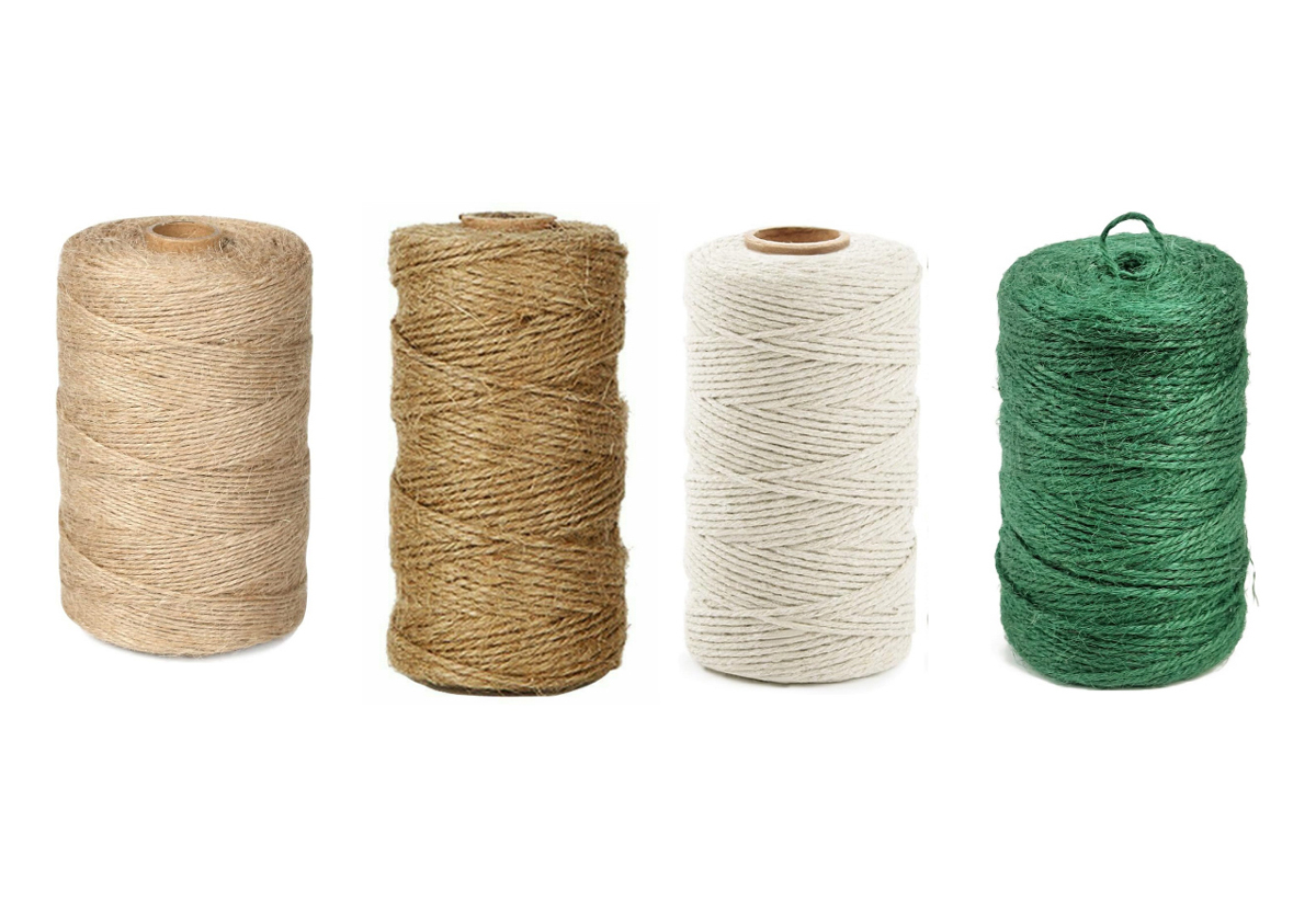 vier bunte Garne aus Baumwolle, Jute, Sisal und Polypropylen.