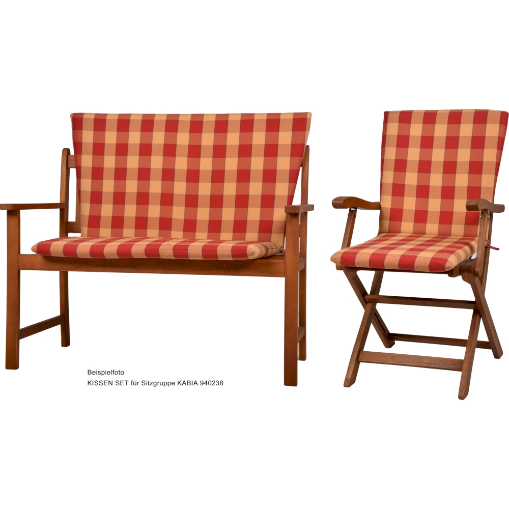 Das 3-teilige Auflagen-Set "KABIA" ist die perfekte Ergänzung für Ihre Gartenmöbel. Es besteht aus passenden Polstern für zwei Niederlehner-Stühle und eine 2-Sitzer Bank. Der Bezug besteht aus 100% Polyester (prf) in einer attraktiven Kombination aus Rot und Orange, was Ihrem Garten oder Ihrer Terrasse eine lebendige Farbnote verleiht.