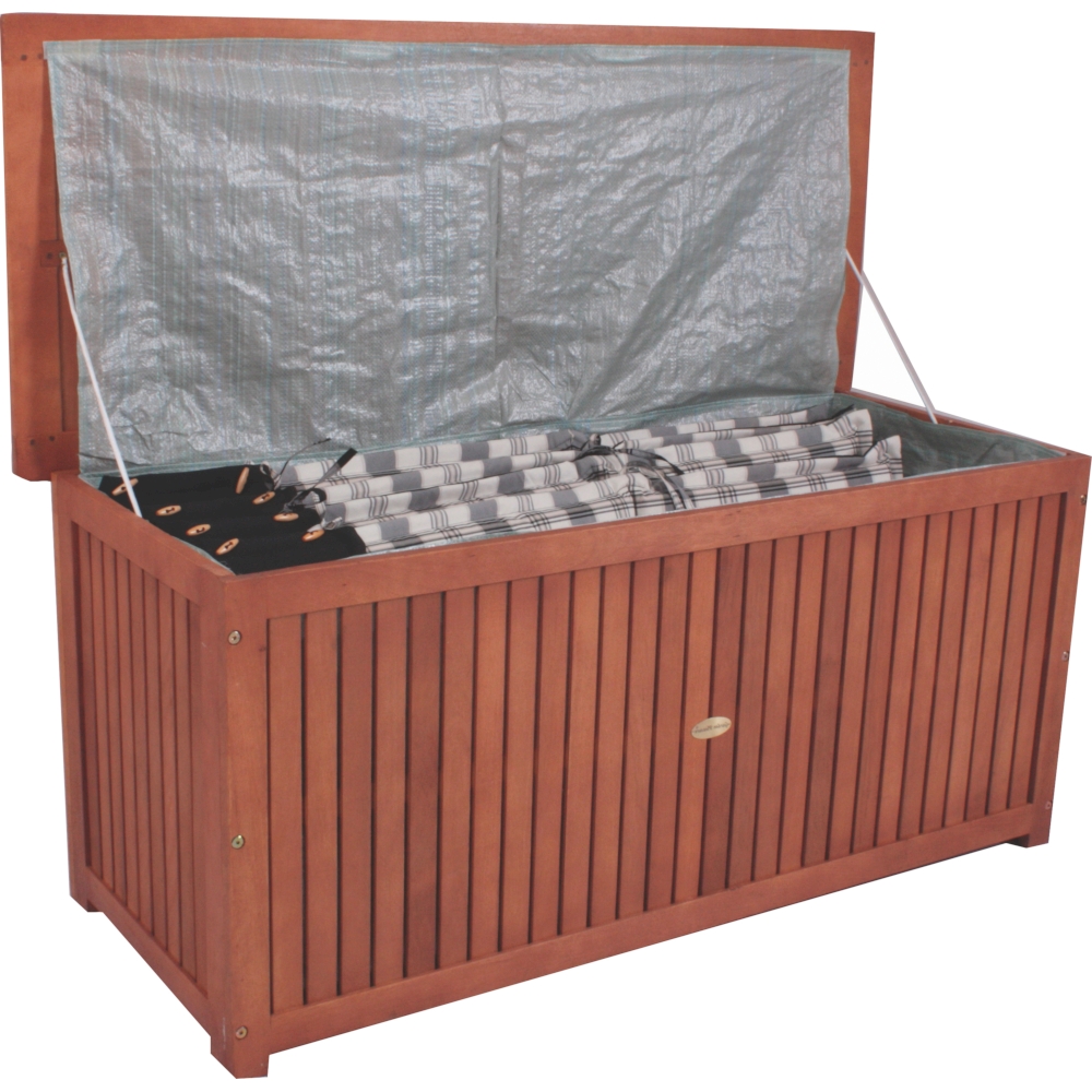 Auflagenbox inkl. Innenfolientasche aus Akazienholz. Maße (HxTxB): außen: 58 x 55 x 133 cm innen: 48 x 47 x 121 cm - Zum Schutz Ihrer Auflagen ist die Box innen mit einer kräftigen Folientasche ausgeschlagen (wird durch Klettverschlüsse befestigt). Ihre Auflagen sind dadurch gegen Luftfeuchtigkeit und leichten Regen geschützt. Bei starkem Wind mit Regen kann Nässe eindringen. Deshalb ist es ratsam die Box an einen geschützten Platz zu stellen, oder bei entsprechende Wetterverhältnissen abzudecken. - Da es sich bei Holz um ein Naturprodukt handelt, kann die Farbe ein wenig variieren. Um die Schönheit des Holzes zu erhalten, sollten Sie folgende Hinweise beachten: Holz ist ein lebendiges Material, geringfügige Rissbildung und allmähliche Farbveränderungen gehören zum normalen Verhalten von Harthölzern. Um das Aussehen zu erhalten ölen Sie das Holz regelmäßig ein. Es ist ganz natürlich, dass das Holz durch Witterungseinflüsse rau wird. Benutzen Sie zur Pflege gute Reinigungsprodukte und Öle. Für die Überwinterung sind ungeheizte, gut belüftete Räume zu empfehlen. Da Holz durch Temperatur- und Feuchtigkeitsschwankungen arbeitet, müssen nach längerer Zeit eventuell die Schrauben leicht nachgezogen werden. Beachten Sie bitte die der Lieferung beigelegte Pflegeanleitung - Die Box wird demontiert im Originalkarton geliefert, Montageanleitung und Material liegen dabei.