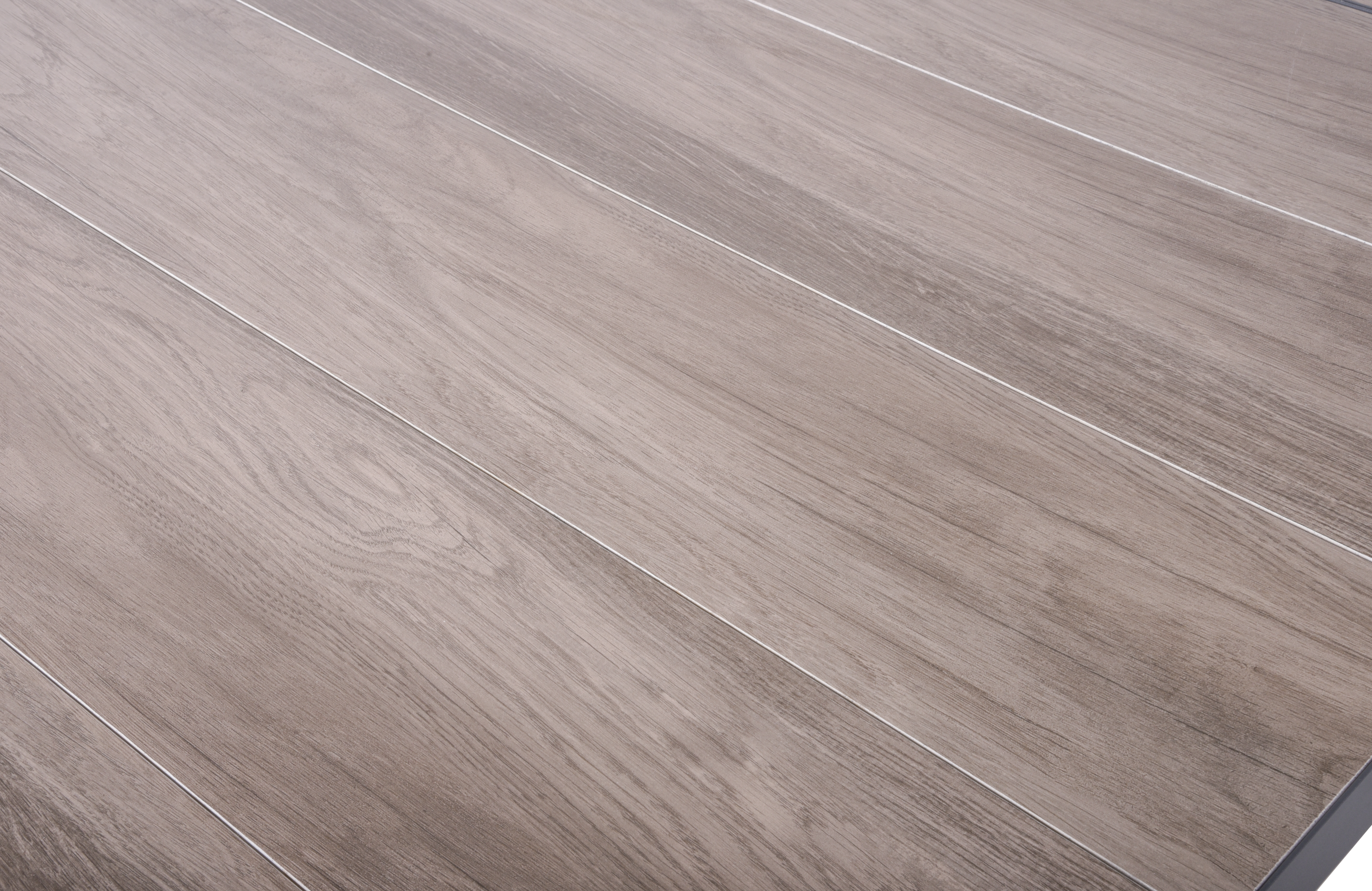 Die Tischplatte in Eichenholz-Optik aus Keramik verleiht dem Tisch eine natürliche und zeitlose Ästhetik, während sie gleichzeitig pflegeleicht und strapazierfähig ist.