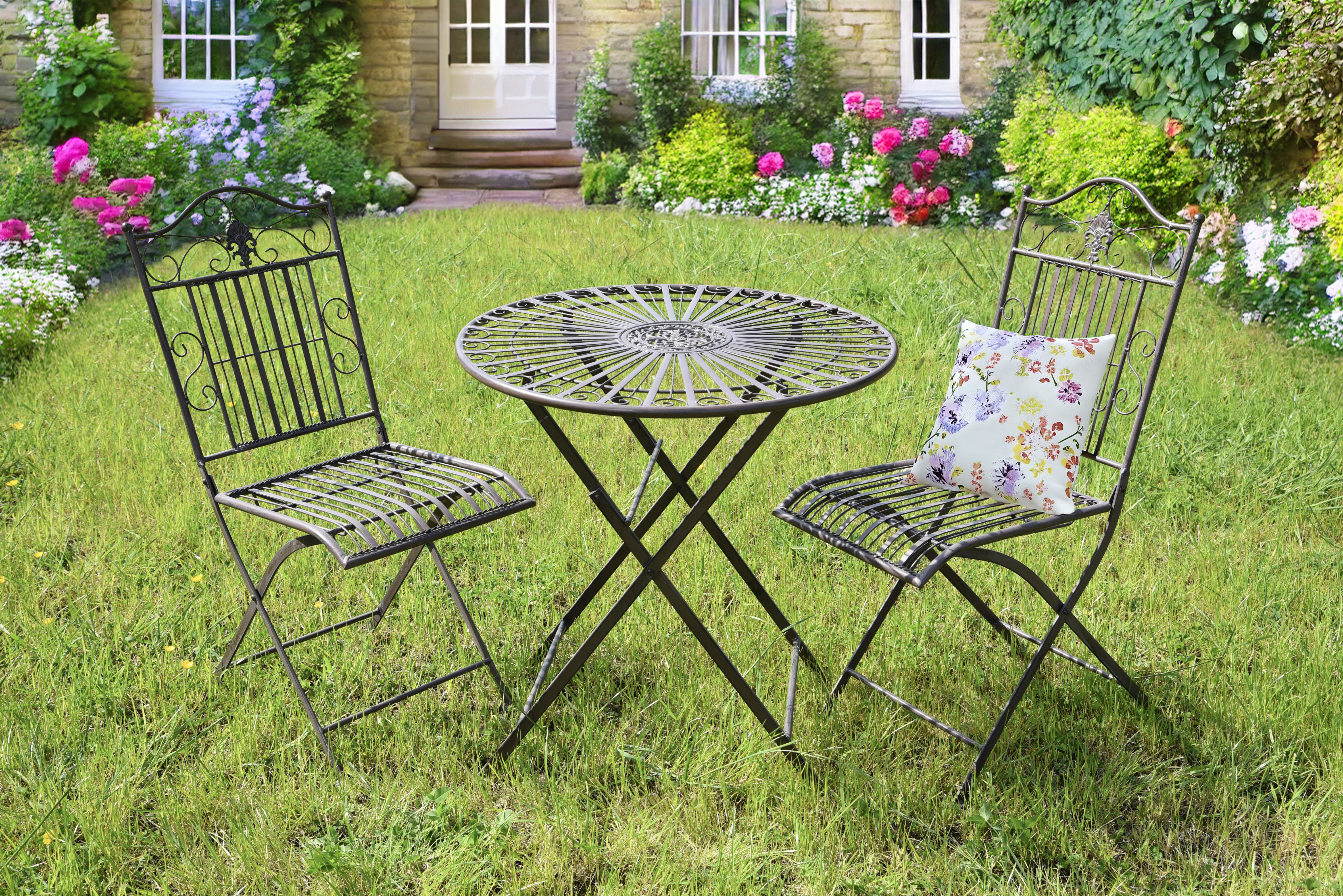 Dieses Set besteht aus einem klappbaren Tisch und zwei Stühlen, die aus pulverbeschichtetem Metallstahl in einem eleganten Schwarzbraun gefertigt sind.