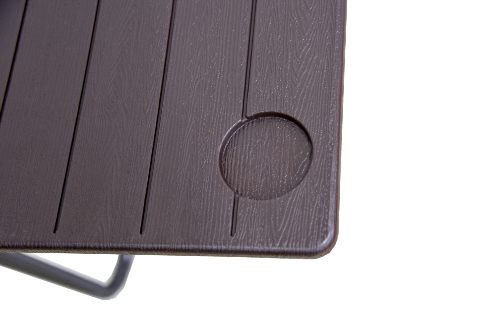 Der Hängetisch hat ein Stahlgestell (schwarz) und die Tischplatte hat eine Holzoptik (Material Kunststoff / HDPE).