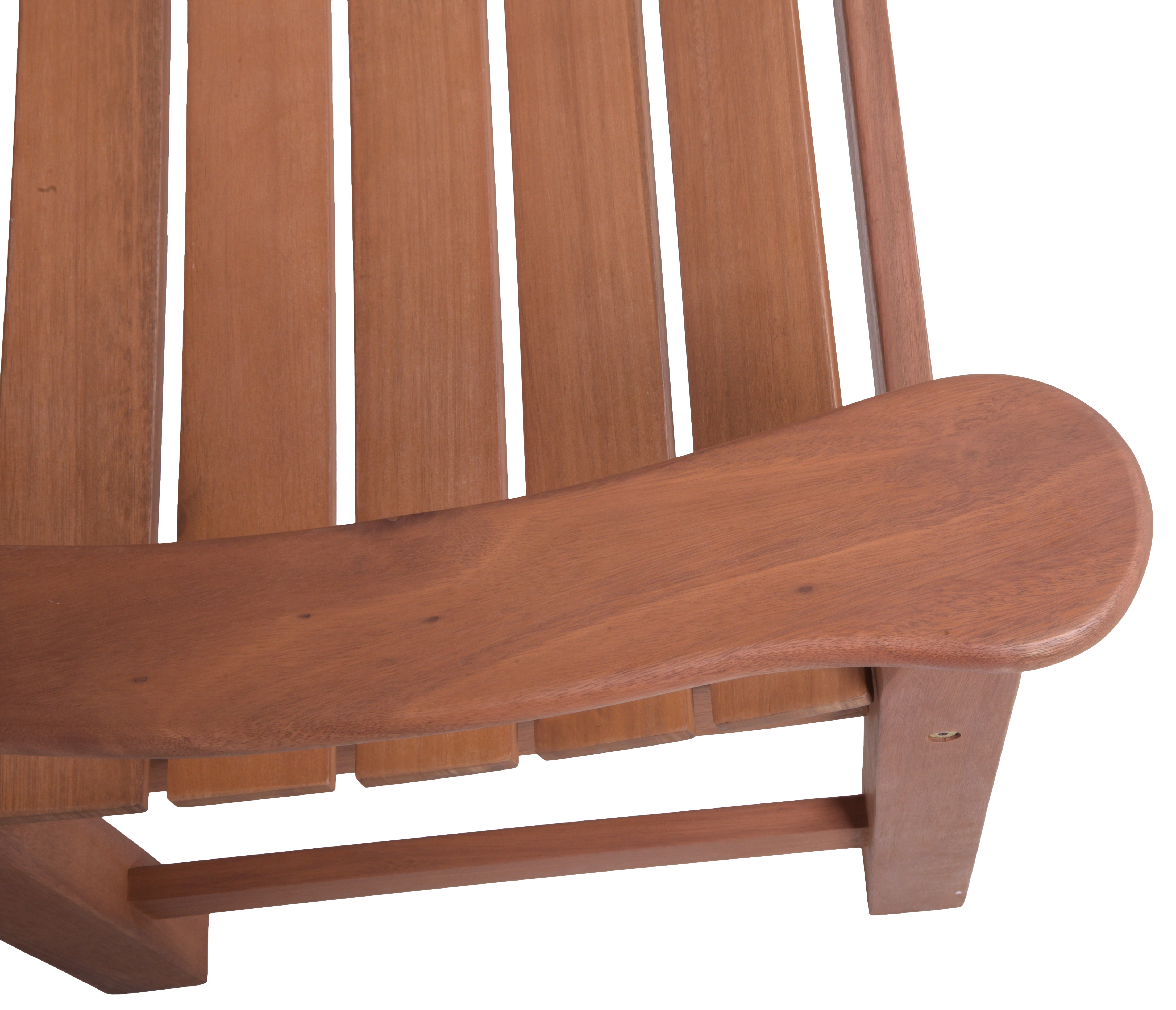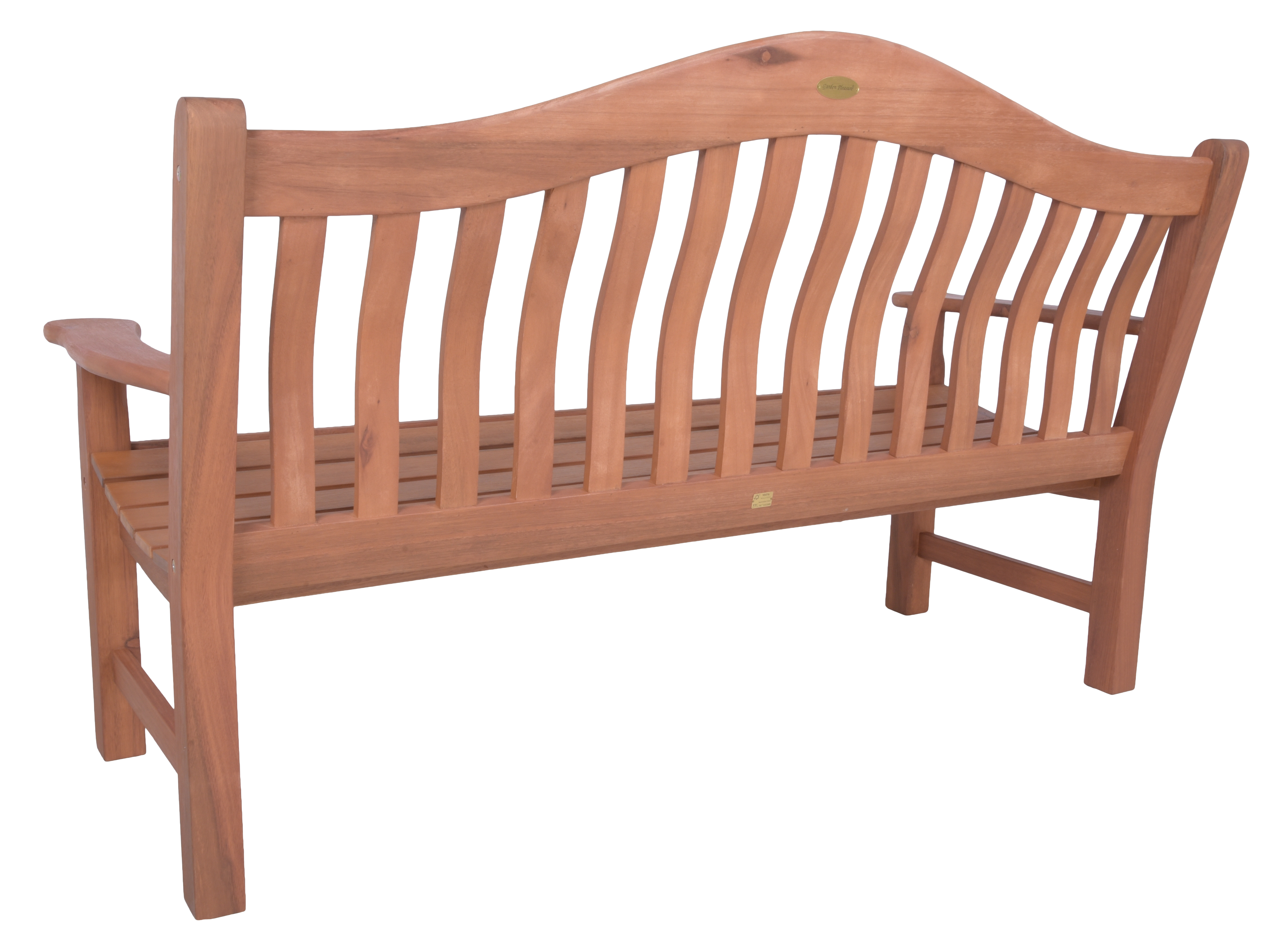 Durch das mittelrot geölte Eukalyptusholz erinnert die Bank mit großzügigen Armauflagen an Teakholz.