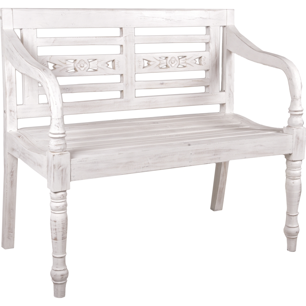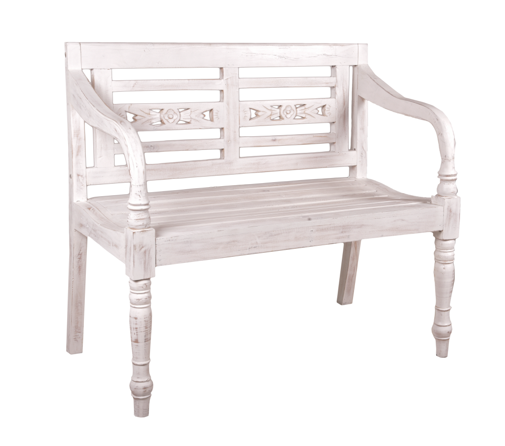 Die weiße Antik-Oberfläche verleiht der Bank MOYO einen besonderen Charme und fügt sich perfekt in jede Umgebung ein.