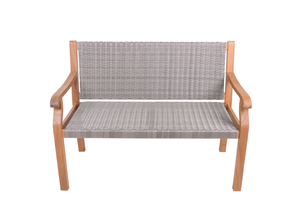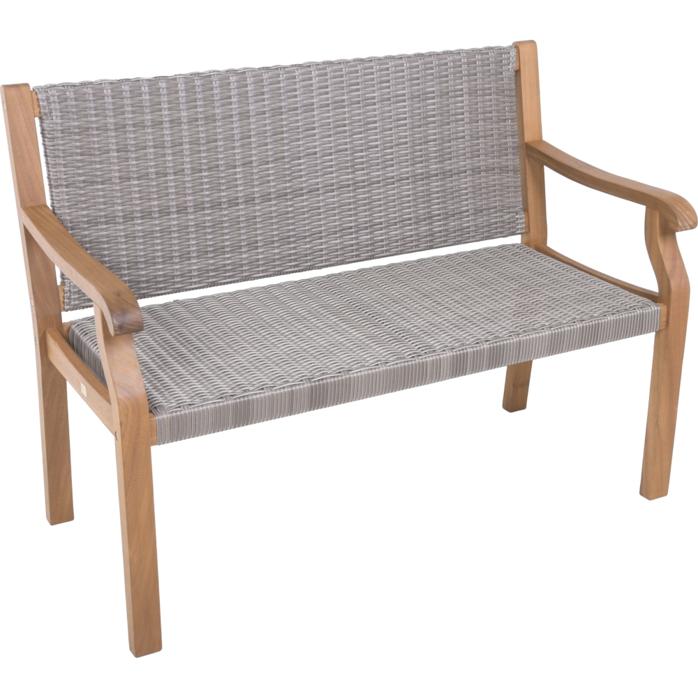 Das halbrunde Kunststoffgeflecht in Grau verleiht der Bank eine moderne Note und sorgt gleichzeitig für Komfort und Stabilität.