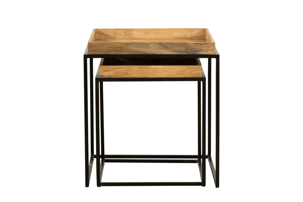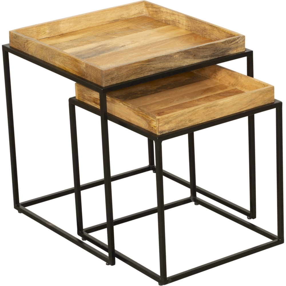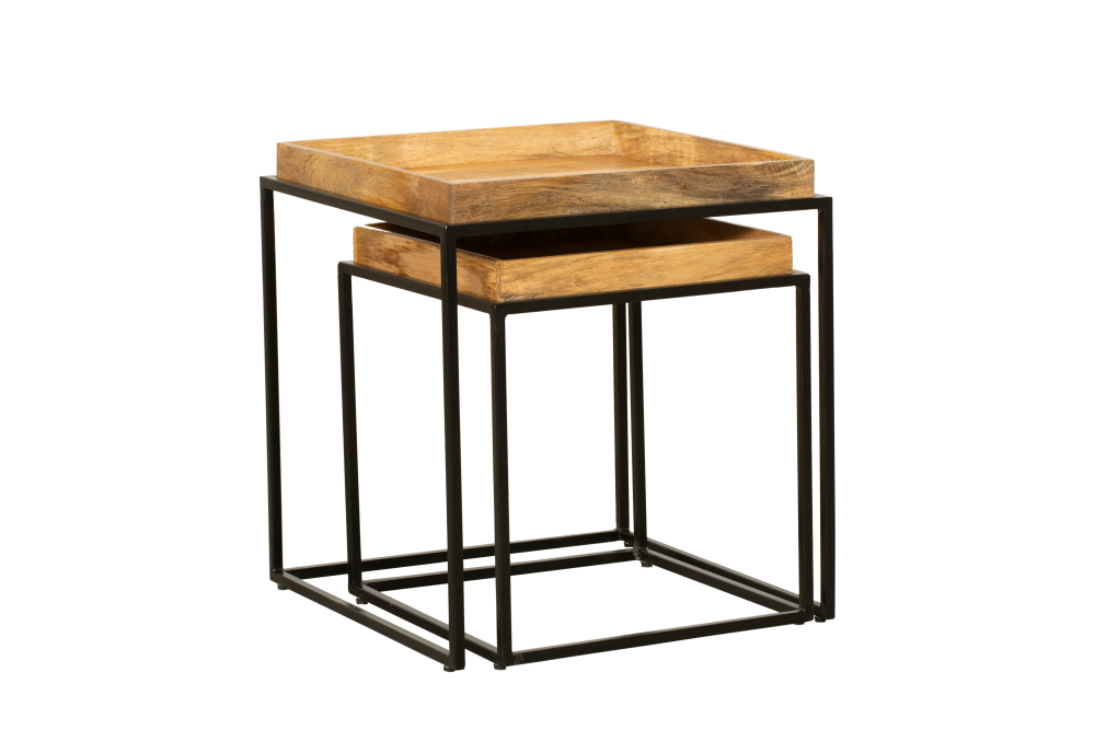 Die Tischplatten sind aus Massivholz (Recyceltes Mangoholz massiv, Oberfläche lackiert) und das Gestell ist jeweils aus schwarzem Stahl (pulverbeschichtet).