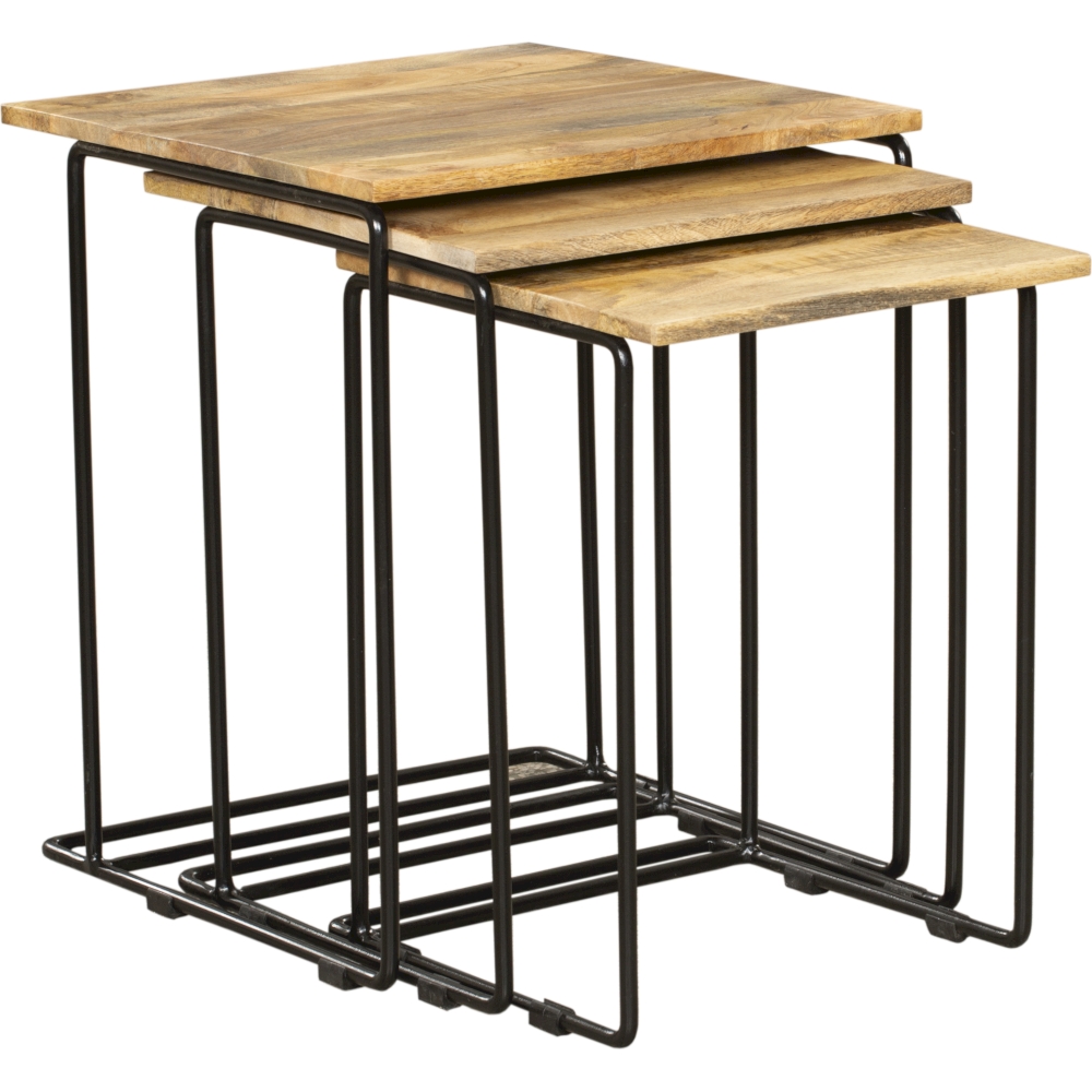 Die Tischplatten sind aus Massivholz (Recyceltes Mangoholz massiv, Oberfläche lackiert) und das Gestell ist jeweils aus schwarzem Stahl (pulverbeschichtet).