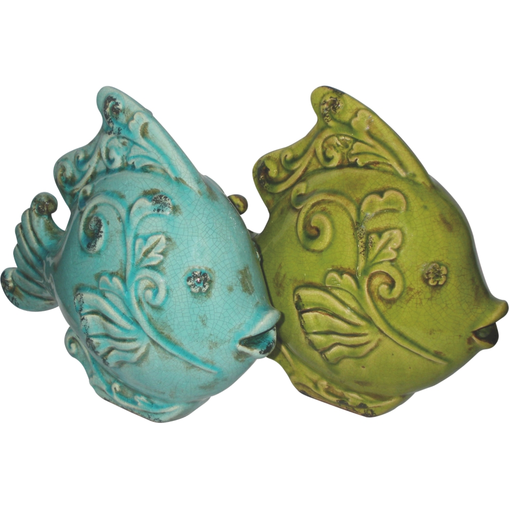 Diese charmanten Keramikfische in den Farben Blau und Grün sind eine bezaubernde Ergänzung für Ihre Dekoration. Jeder Fisch strahlt Individualität und Kunsthandwerk aus. Das Set enthält jeweils einen Fisch in Blau und Grün, die in Ihrer Einrichtung eine frische und lebendige Note verleihen.