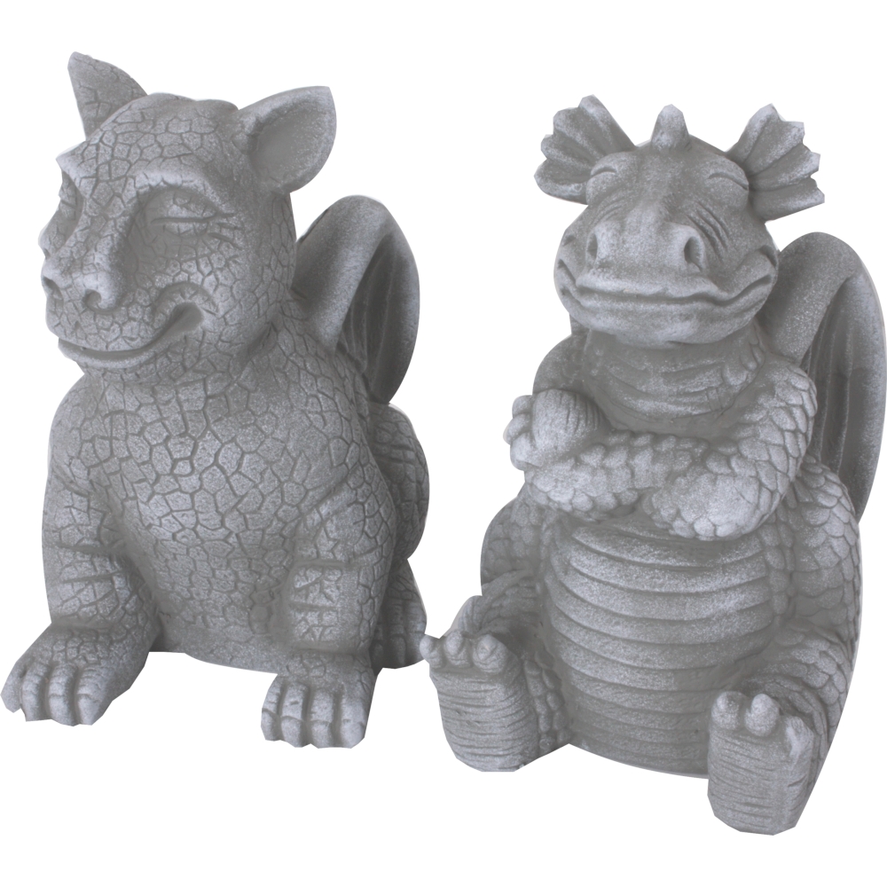 Jede Figur ist aus strapazierfähigem, grauem Keramik gefertigt und sorgfältig gestaltet, um eine beeindruckende Detailtreue zu bieten. Das Set umfasst zwei verschiedene Drachenfiguren, die Ihren Garten oder Ihre Terrasse mit einem Hauch von Mystik und Abenteuer beleben.