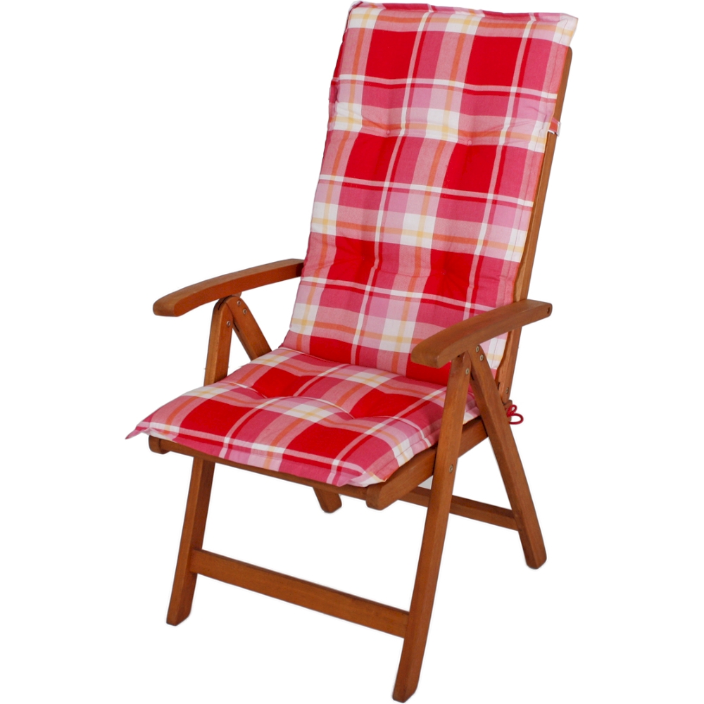 Die Hochlehner-Auflage "Bristol EXQ. 10443-311" ist ein bequemes und stilvolles Polster, perfekt für Hochlehner-Gartenstühle. Der Bezug besteht aus einer hochwertigen Mischung von 48% Baumwolle und 52% Polyester und zeigt ein klassisches, kariertes Muster in den Farben Rot und Weiß.