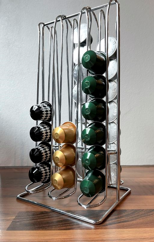 Der Kapselspender aus verchromtem Metall ist eine elegante und praktische Aufbewahrungslösung für Kaffeekapseln. Hergestellt aus hochwertigem verchromtem Metall, zeichnet sich dieser Spender durch seine Robustheit und zeitlose Optik aus. Er bietet Platz für eine Vielzahl von Kaffeekapseln und hält sie geordnet und griffbereit.