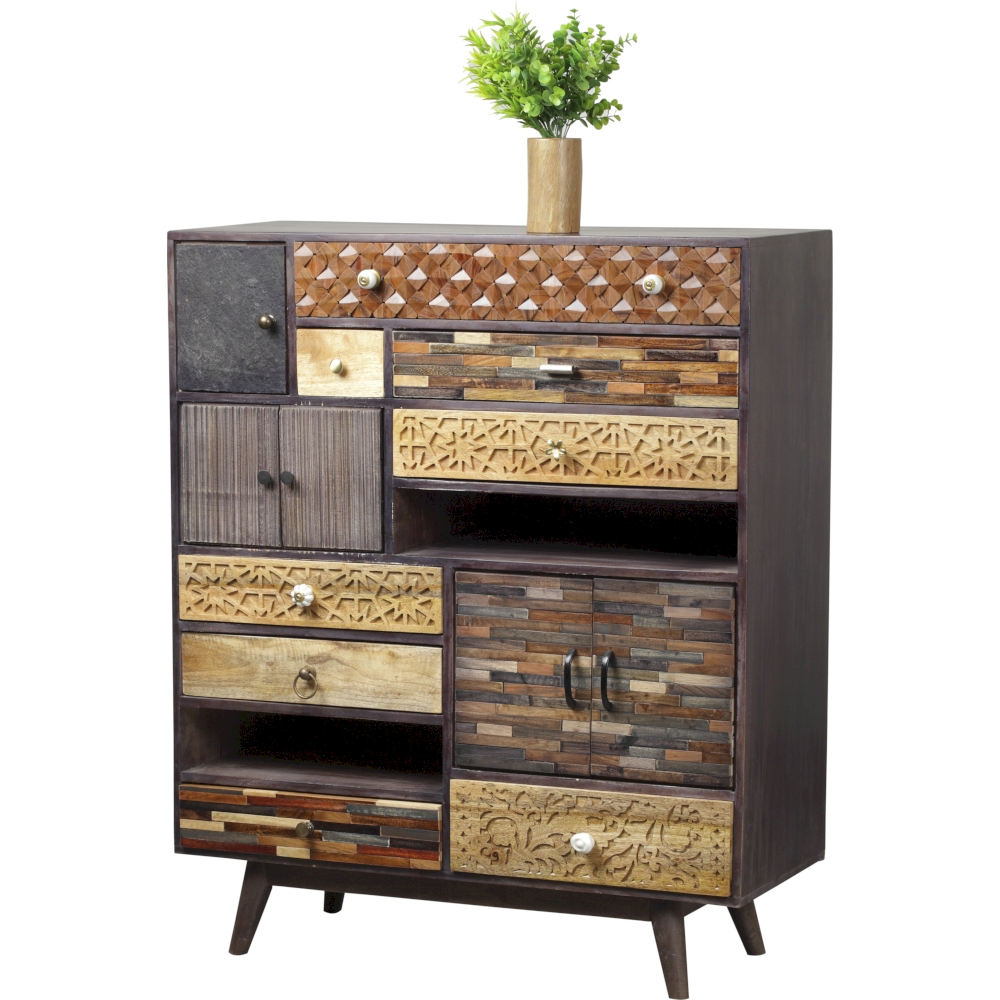 Unsere Kommode TOBOL mit ihrer ausdrucksstarken Optik (Unikat-Look) aus mehreren Materialien (Akazie & Mango massiv recycled, MDF, Oberfläche lackiert) vereint Form und Funktion.