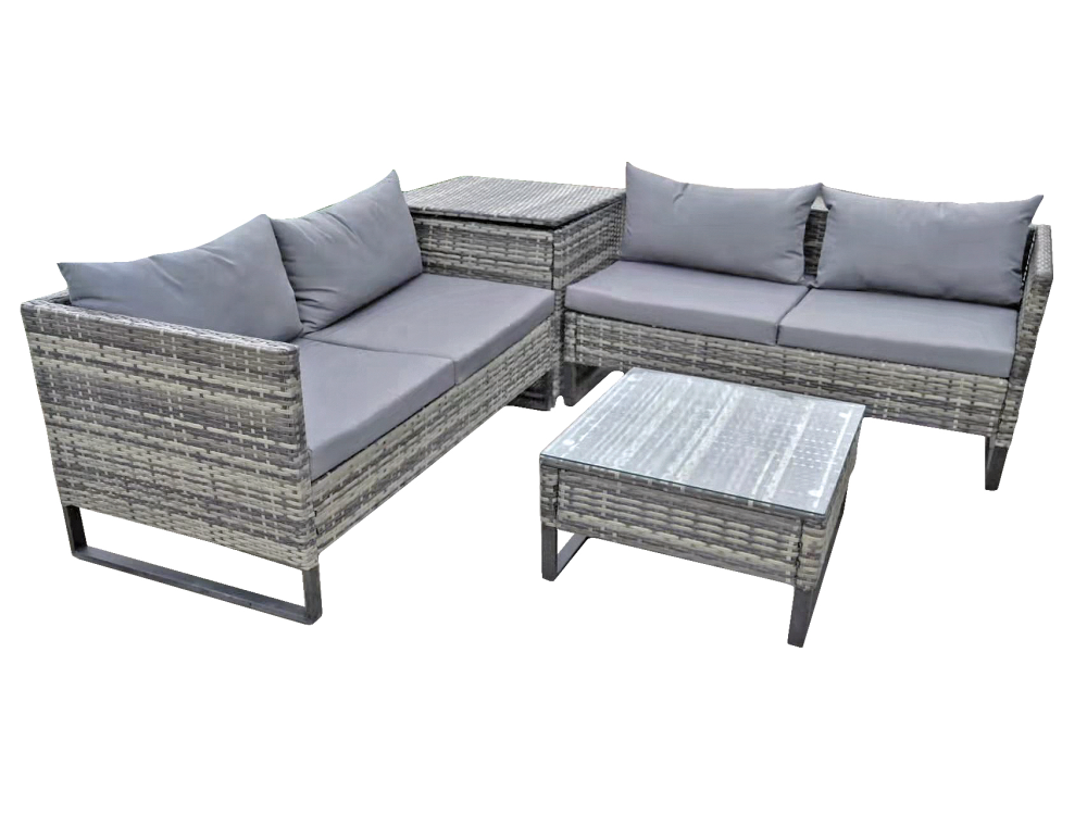 Sie besteht aus robustem Stahl und ist mit einem strapazierfähigen Polyrattan-Kunststoffgeflecht in verschiedenen Grautönen umspannt.