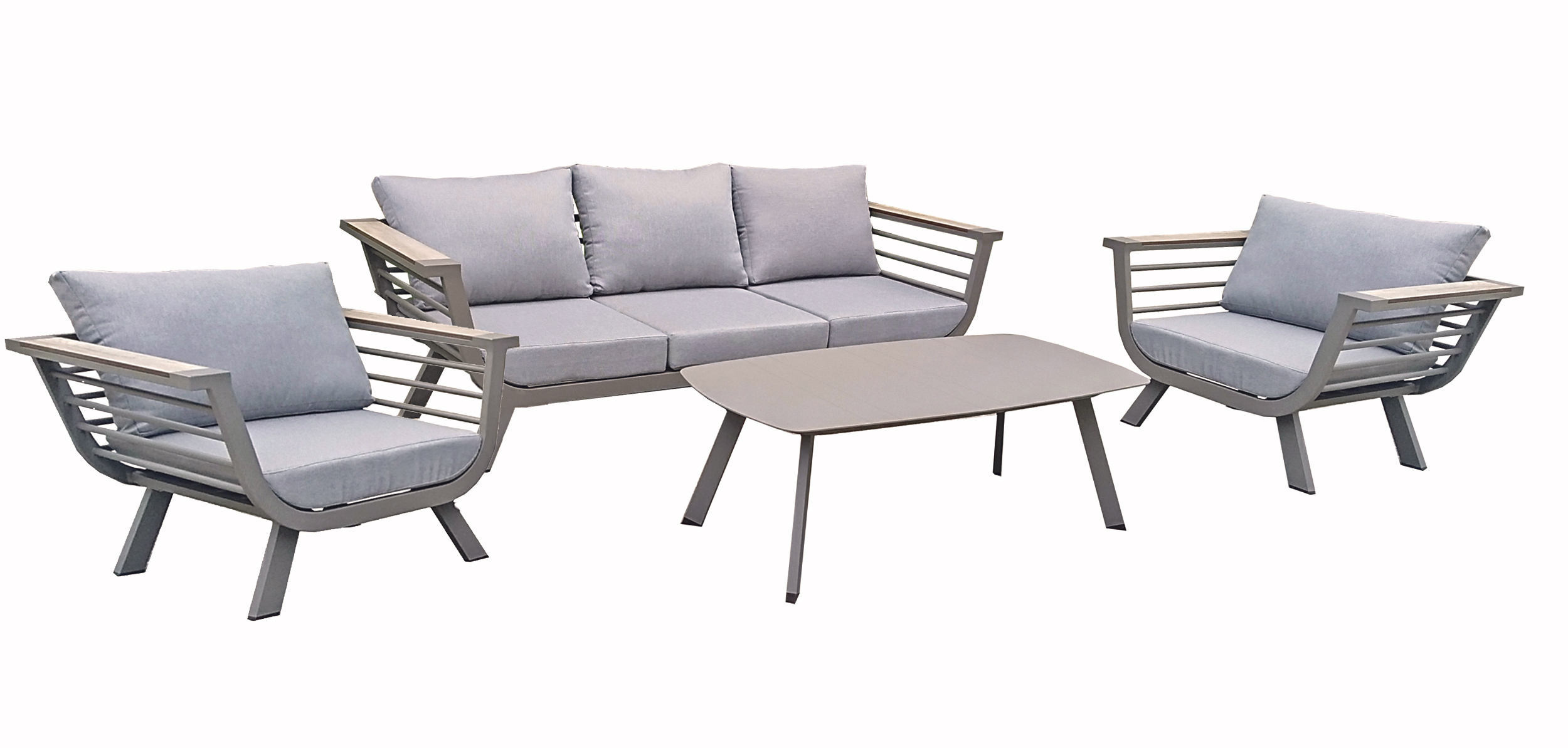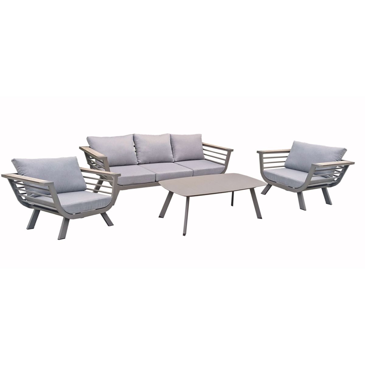 Die Lounge-Gruppe AROA ist die perfekte Wahl für alle, die ihre Terrasse oder ihren Garten in eine stilvolle und bequeme Oase verwandeln möchten. Die Gruppe besteht aus einem geräumigen 3-Sitzer Sofa, zwei gemütlichen Sesseln und einem eleganten Tisch, alle gefertigt aus robustem und langlebigem hellgrauem Aluminium.