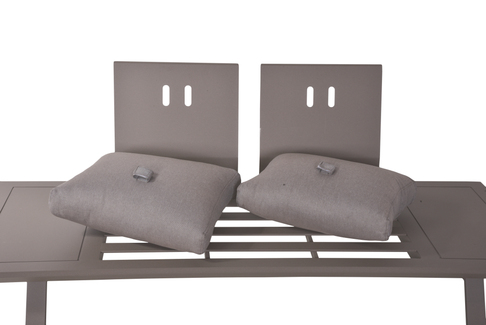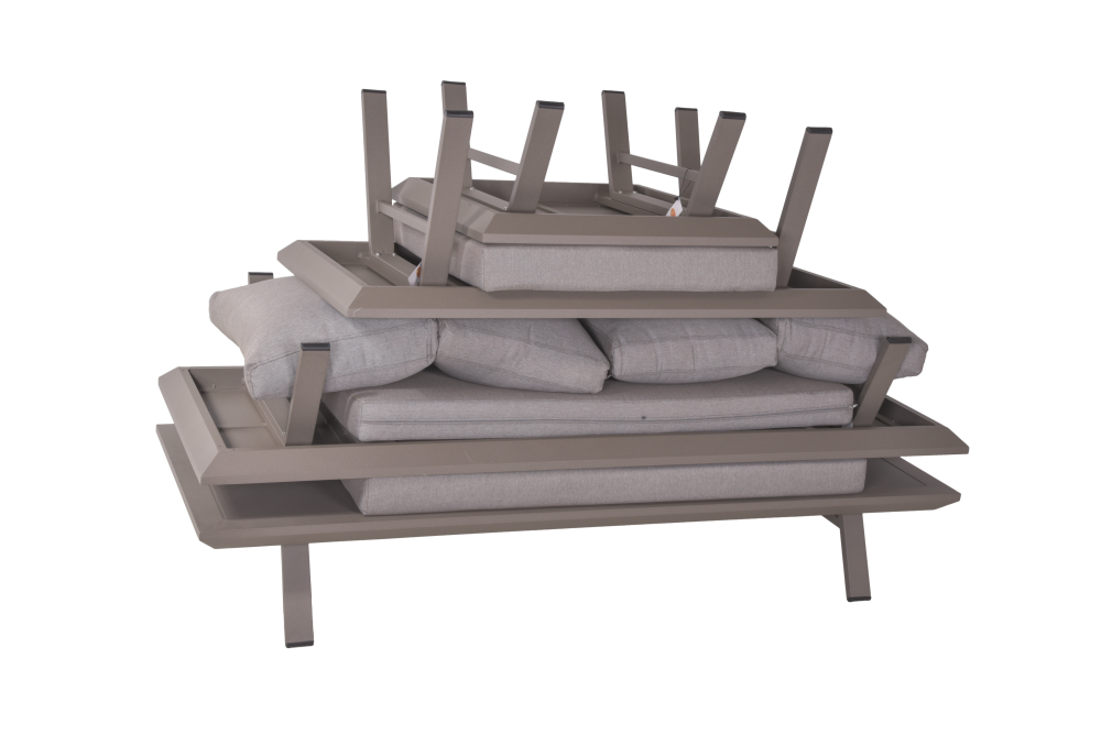 Die Loungemöbel sind mit weichen Kissen in der Farbe Taupe ausgestattet, die für zusätzlichen Komfort sorgen und ein ansprechendes Kontrast zur Aluminiumrahmen bilden. Die Kissen sind aus hochwertigem Polyester gefertigt, das nicht nur bequem, sondern auch wetterbeständig und strapazierfähig ist.