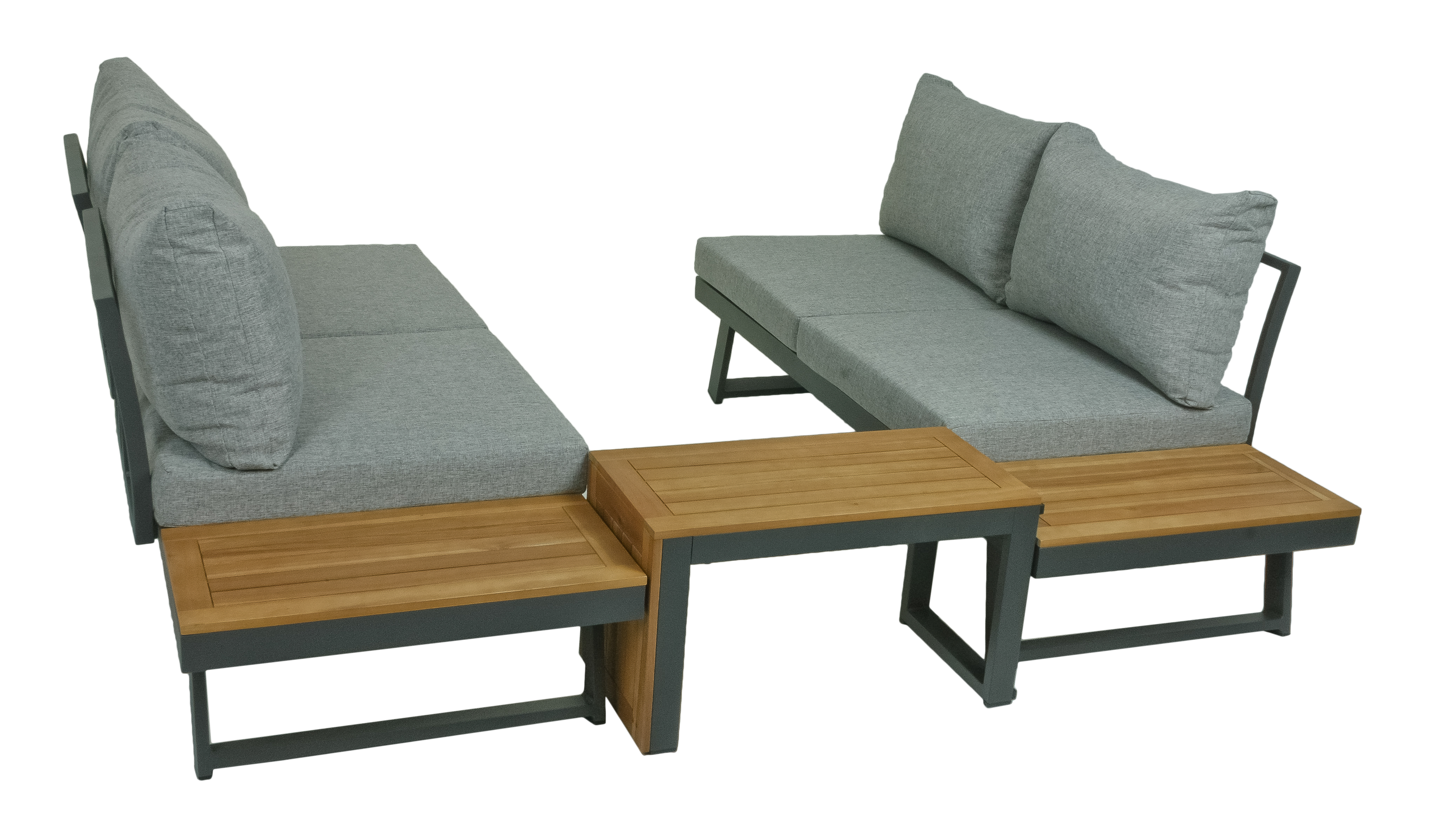 Das schwarze Aluminiumgestell verleiht der Lounge-Gruppe eine moderne und stilvolle Ausstrahlung und ist gleichzeitig langlebig und robust. Die bequemen Sofas sind mit weichen Kissen in der Farbe grau ausgestattet, die für zusätzlichen Komfort sorgen.