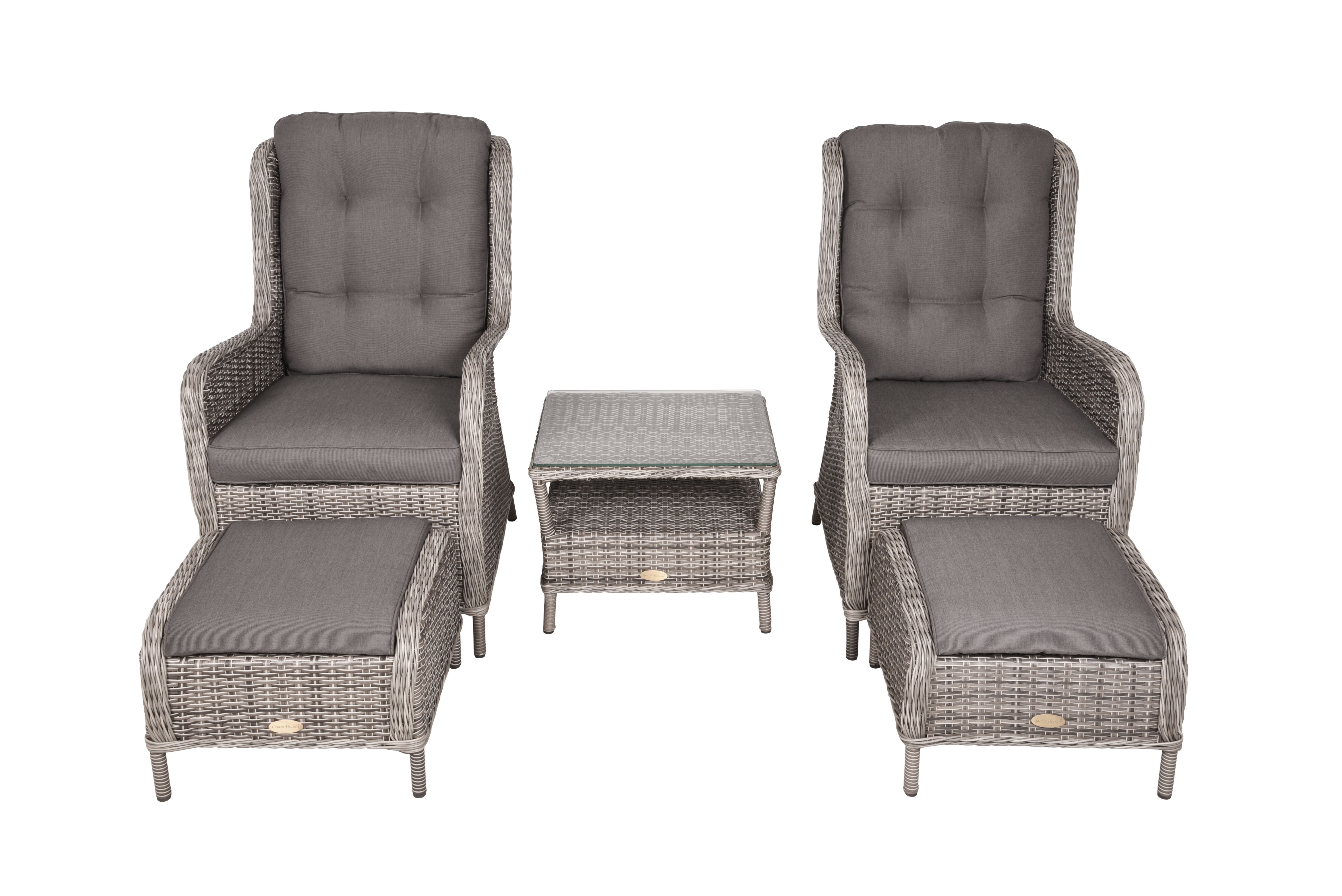 Das Sessel-Set VALENCIA ist eine moderne und bequeme Ergänzung für Ihre Außenbereich. Das Set besteht aus 2 Sesseln, 2 Fußhockern und einem Beistelltisch mit einer klaren Glasplatte, die eine stabile Grundlage für darauf abzustellende Gegenstände, wie beispielsweise Getränke, darstellt. Die gepolsterten Sitzflächen der Sessel und Fußhocker bieten einen hohen Komfort und durch die Rückenkissen aus Polyester in Dunkelgrau sind Sie auch beim Sitzen gut gestützt.