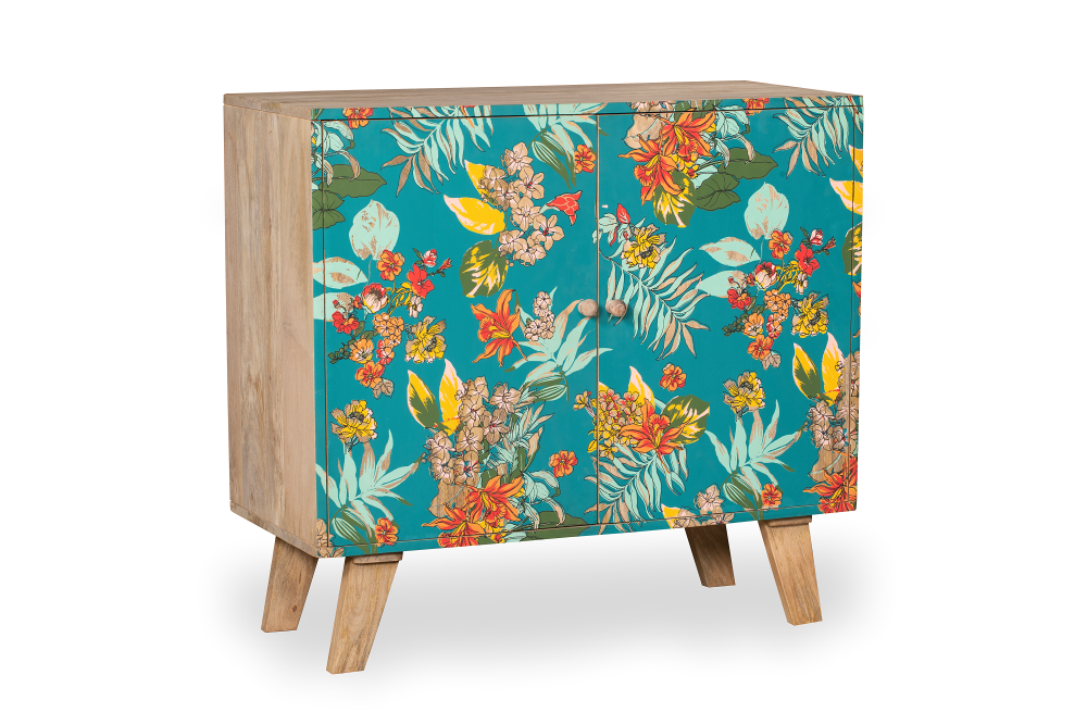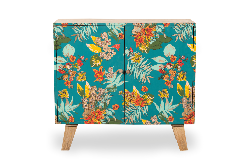 Unser Sideboard REIPUR (Materialmix Mango massiv & MDF, lackiert) mit seiner ausdrucksstarken Optik (Aufdruck mit bunter Pflanzenoptik) beeindruckt durch sein individuelles Design und vereint Form und Funktion.