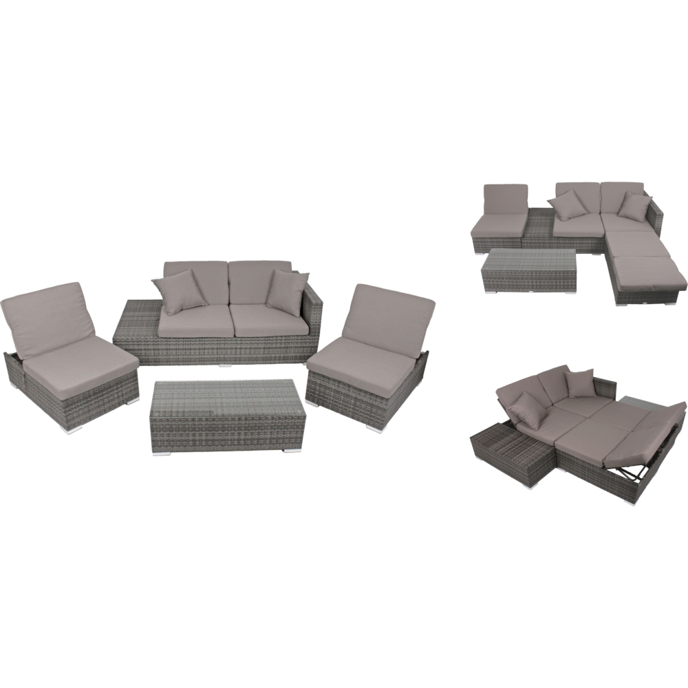 Die Möbelstücke in dieser Sitzgruppe sind aus hochwertigem, grauem Aluminium und grauem Kunststoffgeflecht gefertigt, was ihnen eine moderne Ästhetik und Wetterbeständigkeit verleiht. Sie können die Sitzgruppe ALCUDIA auch in ein gemütliches Bett umwandeln, um bequem im Freien zu schlafen oder zu entspannen.