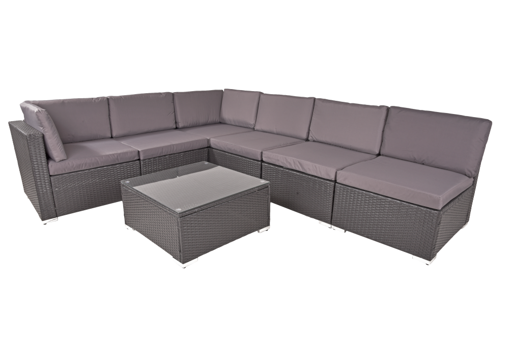 Der Tisch hat eine praktische Glasplatte, die leicht zu reinigen ist und auf der Sie Getränke, Snacks oder andere Gegenstände abstellen können. Die Sitzbezüge der Mittelstücke und Ecksessel sind aus strapazierfähigem Polyester gefertigt und bieten Ihnen einen angenehmen Sitzkomfort.