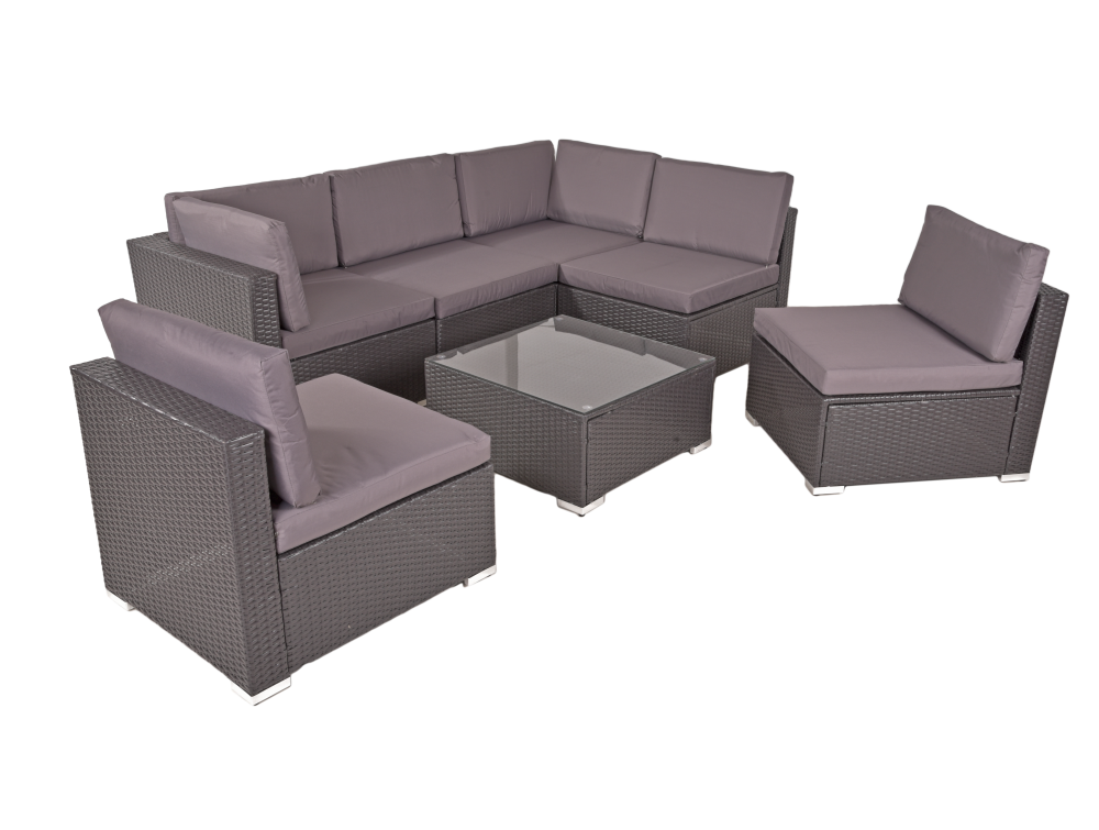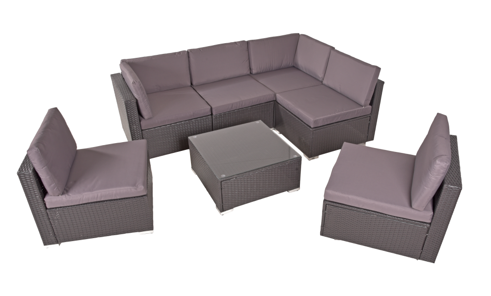 Das Set besteht aus vier Mittelstücken und zwei Eckstühlen, die bequem und komfortabel sind. Alle Stücke haben ein robustes Stahlgestell, das mit Kunststoffgeflecht umwickelt ist. Dieses Material ist robust, wetterbeständig und pflegeleicht, so dass Sie lange Freude an Ihrer Sitzgruppe haben werden.