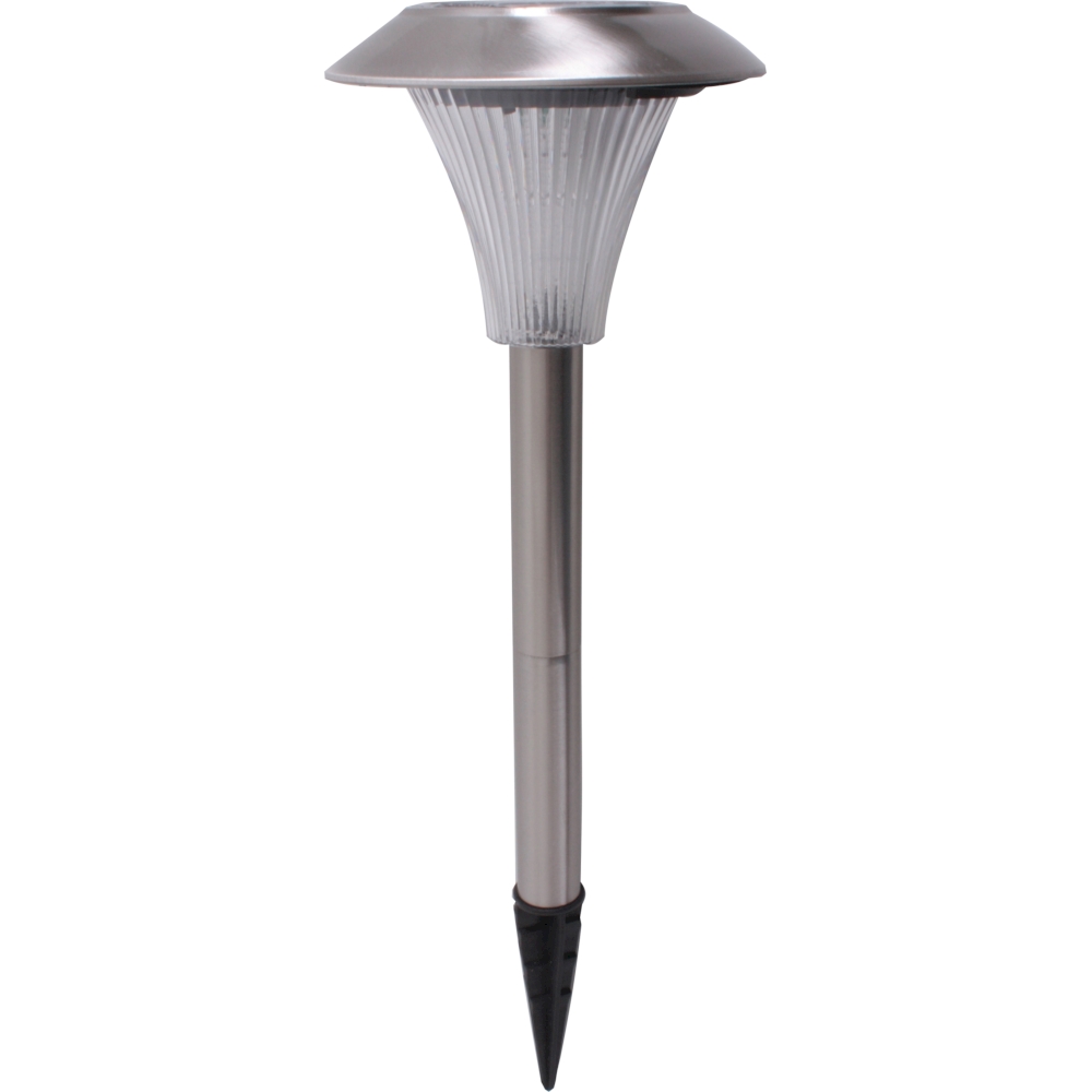 Diese Solar-Leuchte ist eine stilvolle und moderne Beleuchtungsoption für den Außenbereich, hergestellt aus silbernem Edelstahl und Kunststoff. Sie ist mit einer weißen LED ausgestattet, die ein helles und effizientes Licht liefert.