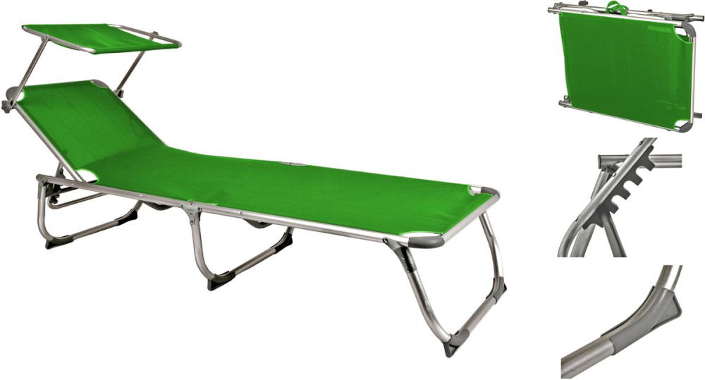 Die Sonnenliege mit Sonnendach KISO ist der ideale Begleiter für entspannte Sonnentage im Freien. Mit ihrem dreibeinigen Design bietet sie Stabilität und Bequemlichkeit in einem attraktiven grünen Farbton. Hergestellt aus strapazierfähigem Kunststoffgewebe und Aluminium, ist diese Liege besonders langlebig und wetterbeständig, was sie perfekt für den Einsatz im Freien macht.