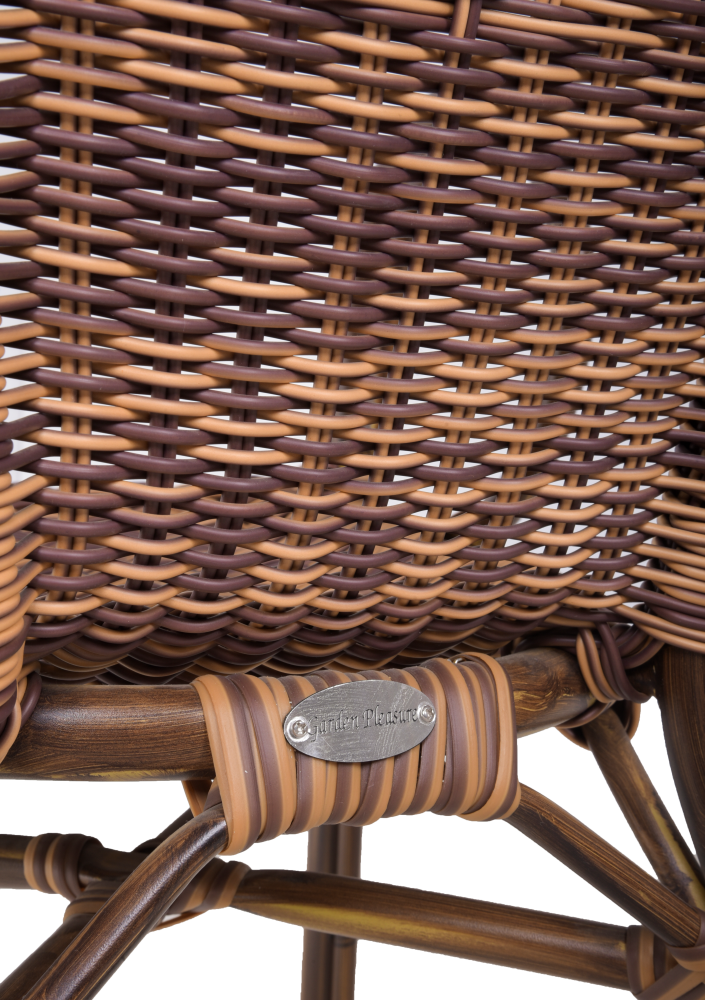 Das braun-honigfarbene Kunststoffgeflecht verleiht dem Stuhl eine natürliche Note und fügt sich harmonisch in verschiedene Umgebungen ein.