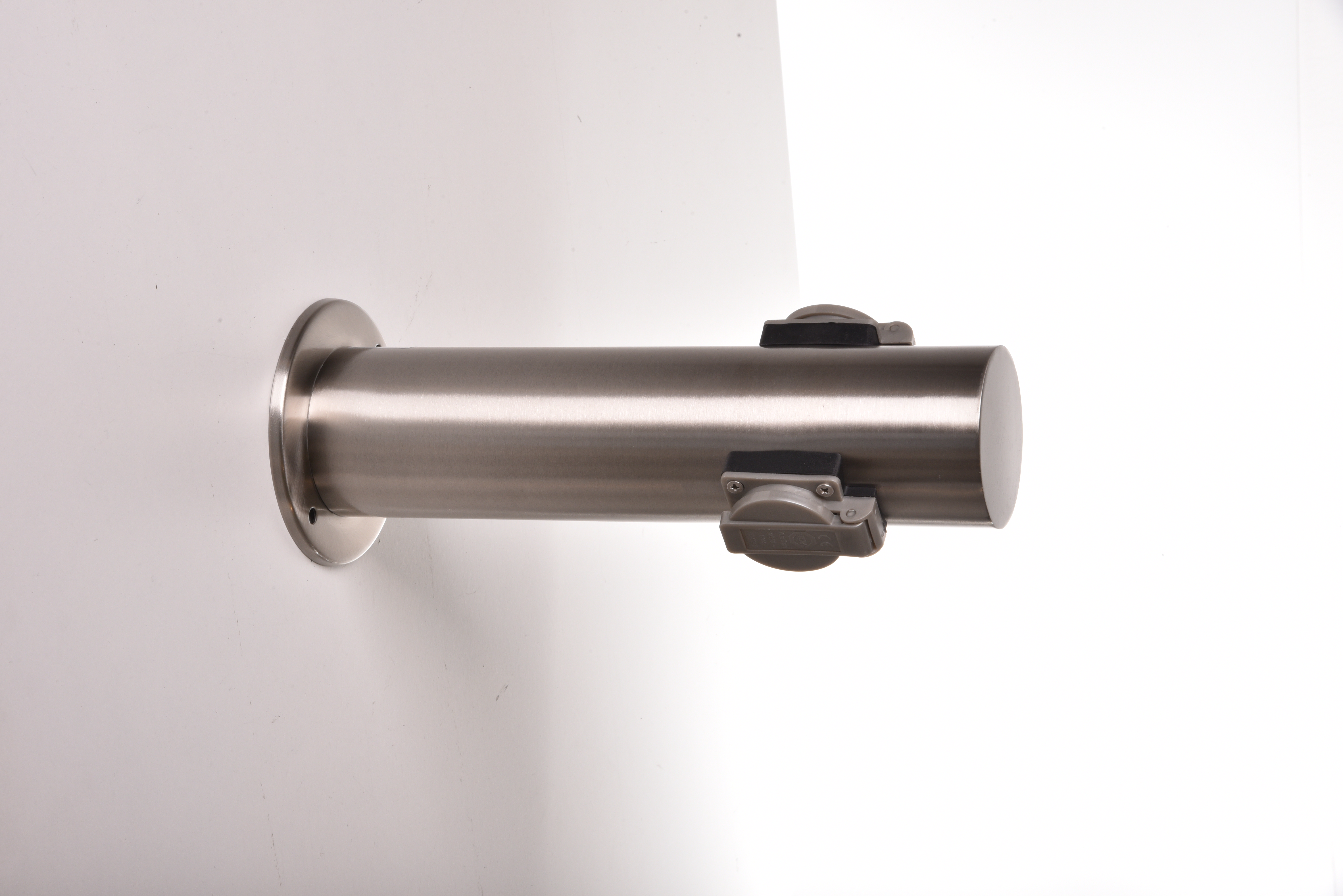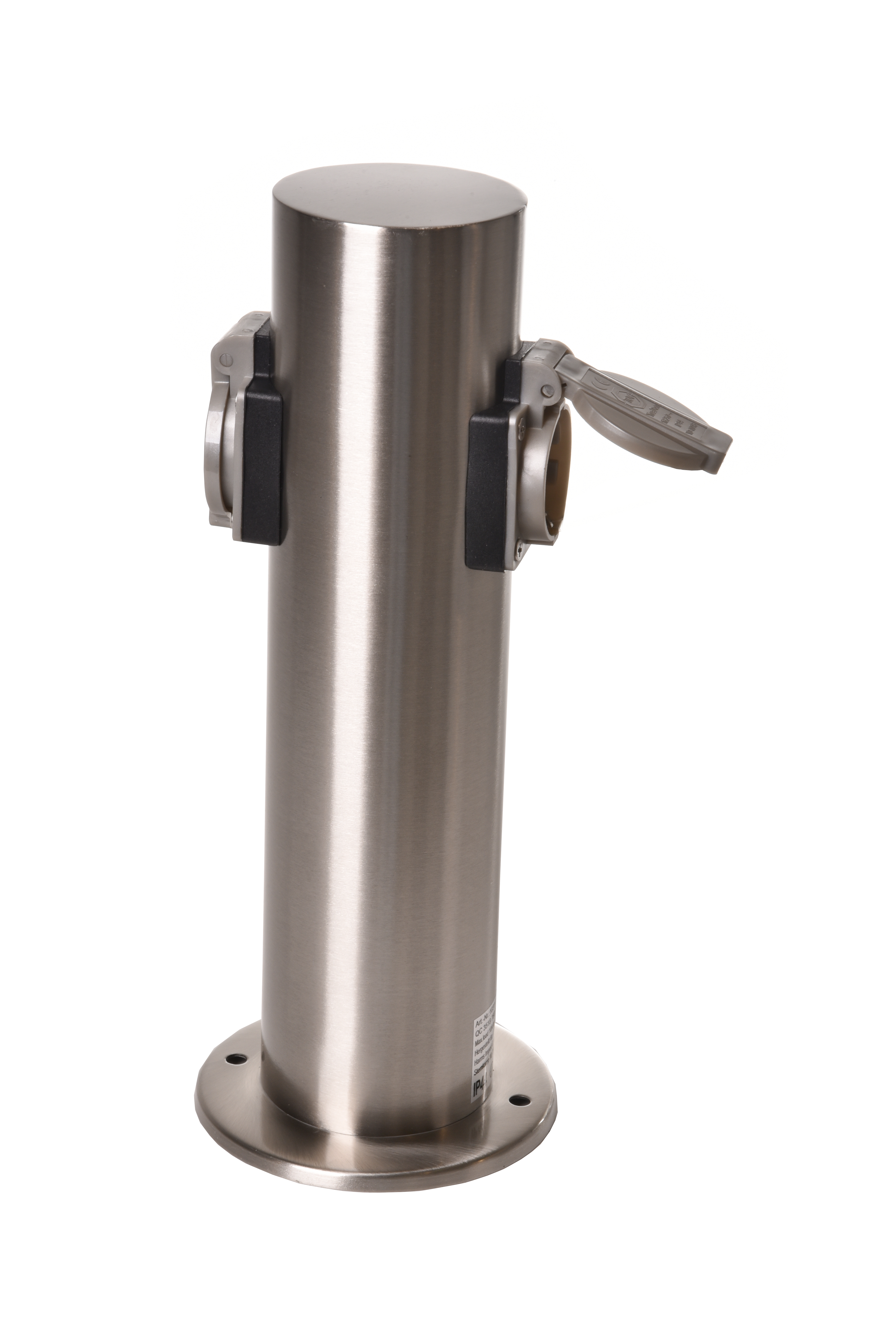 Infotext 1: runder Edelstahlkörper, inkl. 2 Steckdosen