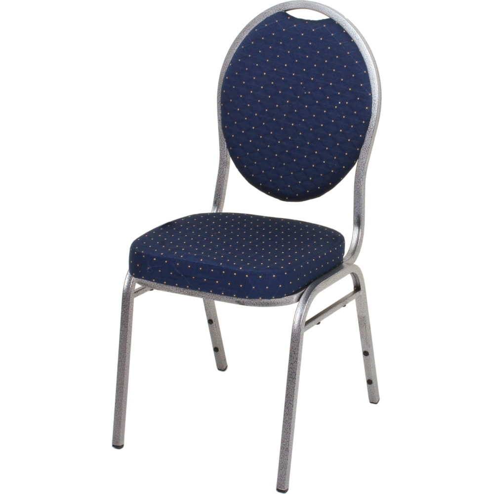 Der Stuhl BANKETT ist die perfekte Wahl der professionellen Gastronomie und privaten Veranstaltungen und Feierlichkeiten. Der stapelbare Stuhl verfügt über ein robustes Stahlgestell in silberner Farbe mit Hammerschlag-Optik, welches für Stabilität und Langlebigkeit sorgt. Die gepolsterte Sitz- und Rückenfläche bietet einen bequemen Sitzkomfort und ist voneinander getrennt am Rahmen befestigt. Das blaue Polster mit goldenen Punkten und einem eleganten Design mit blauen Rauten verleiht dem Bankettstuhl eine ansprechende Optik und fügt sich harmonisch in Säle und Konferenzräume bei Feierlichkeiten und Tagungen ein. Zusätzlich ist der Stuhl entsprechend der geltenden Sicherheitsrichtlinien feuerhemmend ausgeführt und eignet sich neben seiner Robustheit ideal für den Einsatz in der professionellen Gastronomie.