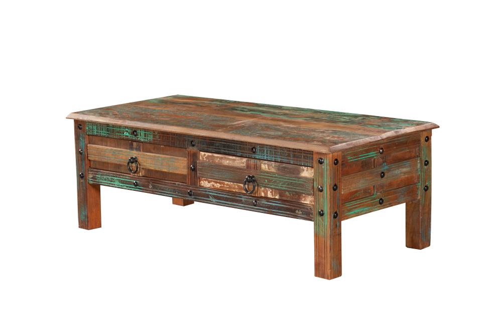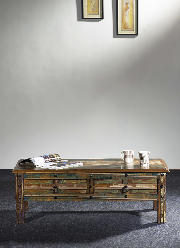 Der Couchtisch KALANKA aus Massivholz (Akazie & Mango, Oberfläche lackiert) beeindruckt durch sein individuelles Design(im Used-Look).