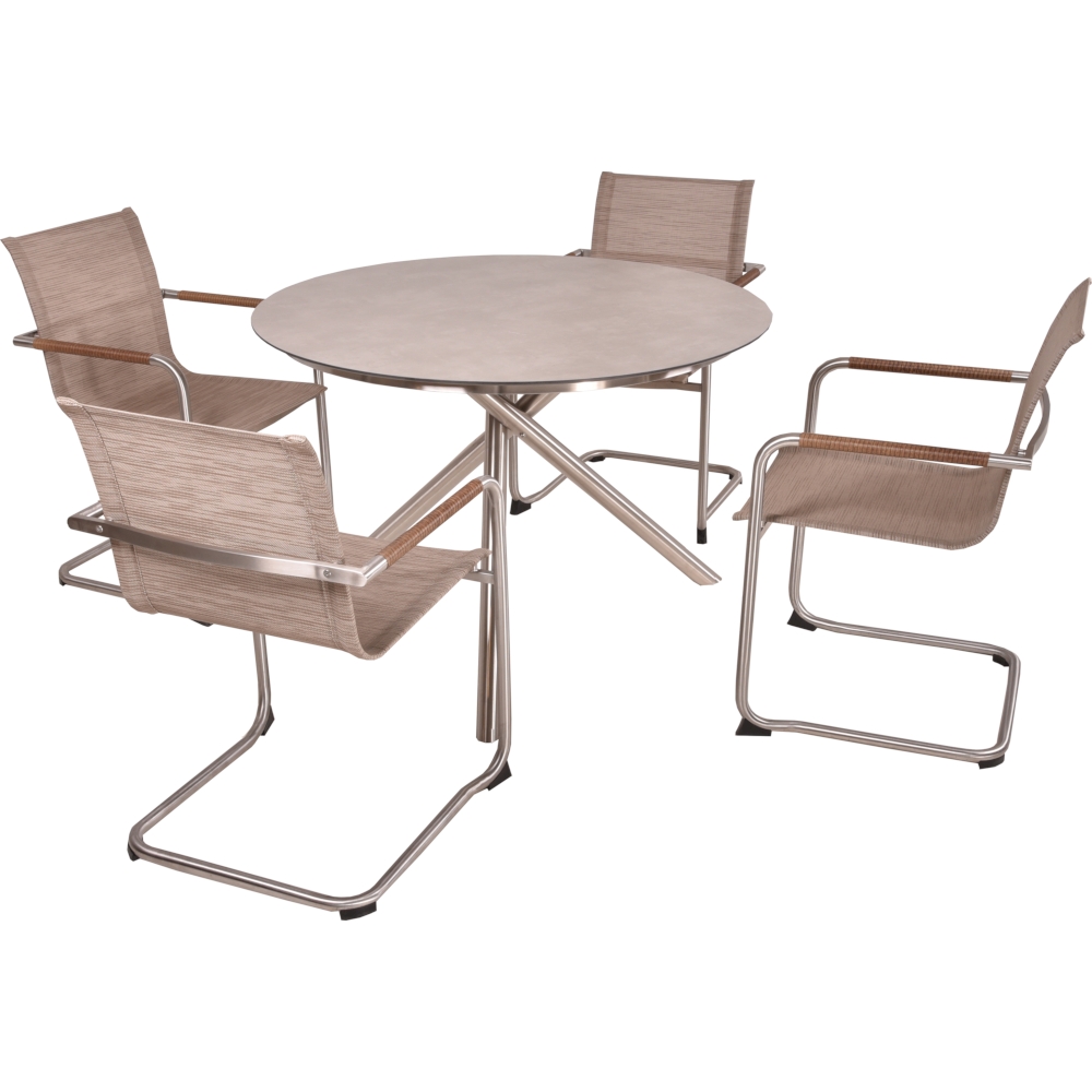 Hergestellt aus hochwertigem Edelstahl und ausgestattet mit einer strapazierfähigen Kunststoff HPL-Tischplatte in Grau, bietet er eine robuste Konstruktion, die den Elementen standhält.