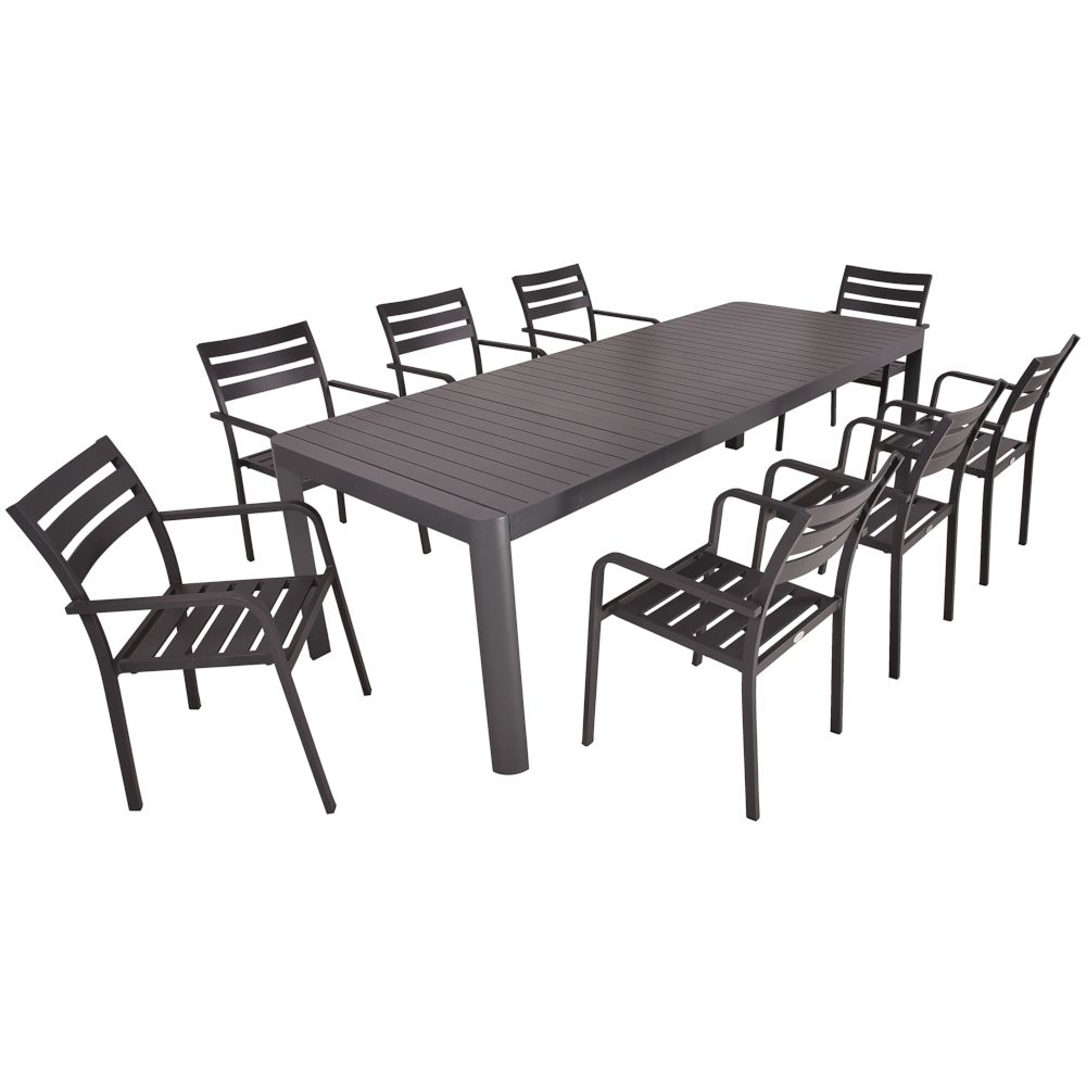 Die Tischgruppe AMIRA ist eine elegante und praktische Lösung, um Ihren Innen- oder Außenbereich stilvoll und komfortabel zu gestalten. Dieses Set besteht aus einem Ausziehtisch AMIRA aus pulverbeschichtetem Anthrazit-Aluminium und sechs Stühlen TREVISO.