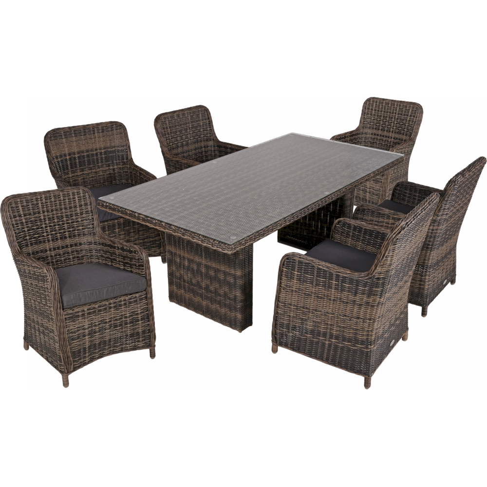 Die sechs Sessel BORDEAUX sind aus pulverbeschichtetem Stahl gefertigt und verfügen über ein kunstvoll gestaltetes nelkenbraunes Kunststoffgeflecht in halbrundem und rundem Design. Die Sessel sind mit Auflagen ausgestattet, die für zusätzlichen Sitzkomfort sorgen.