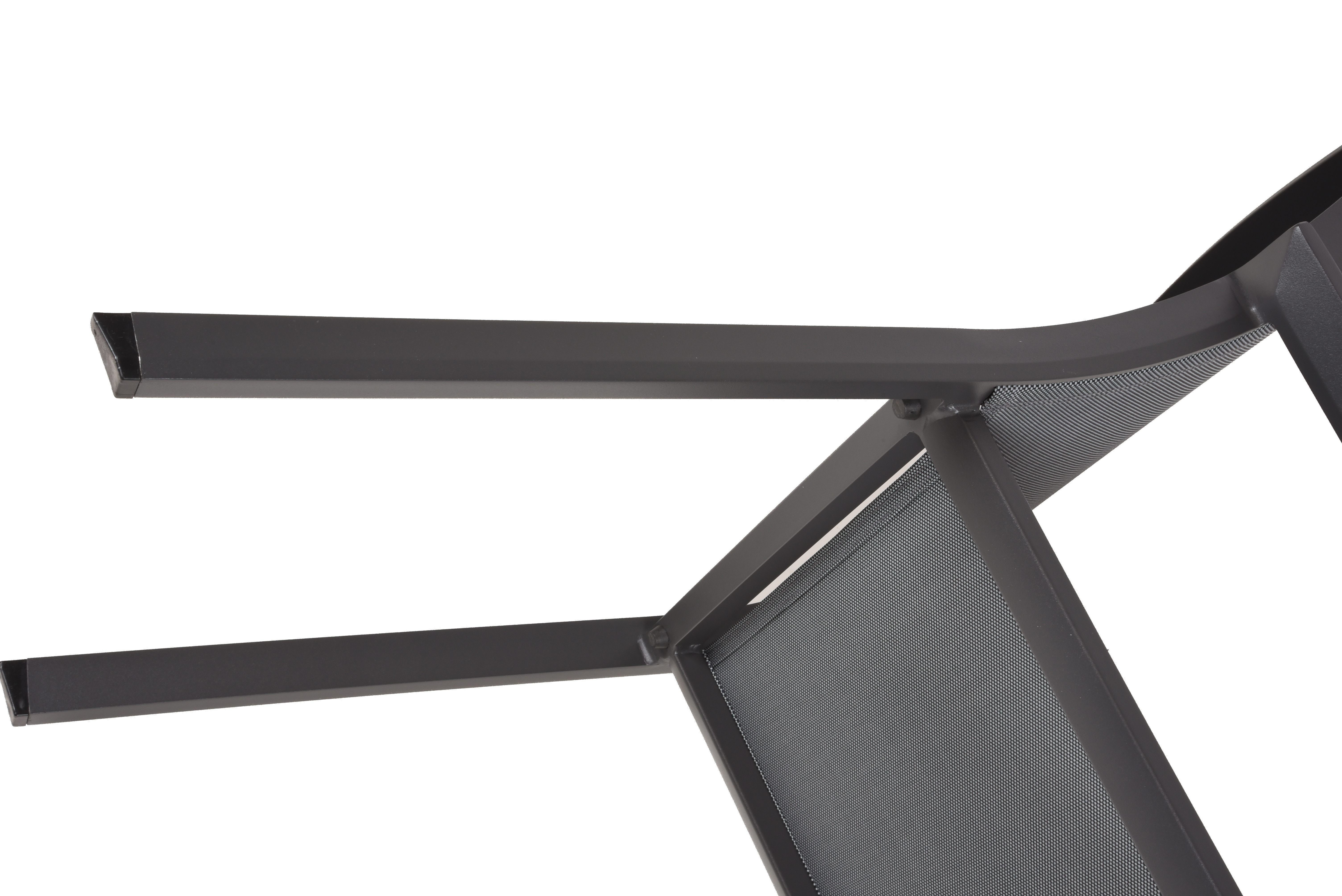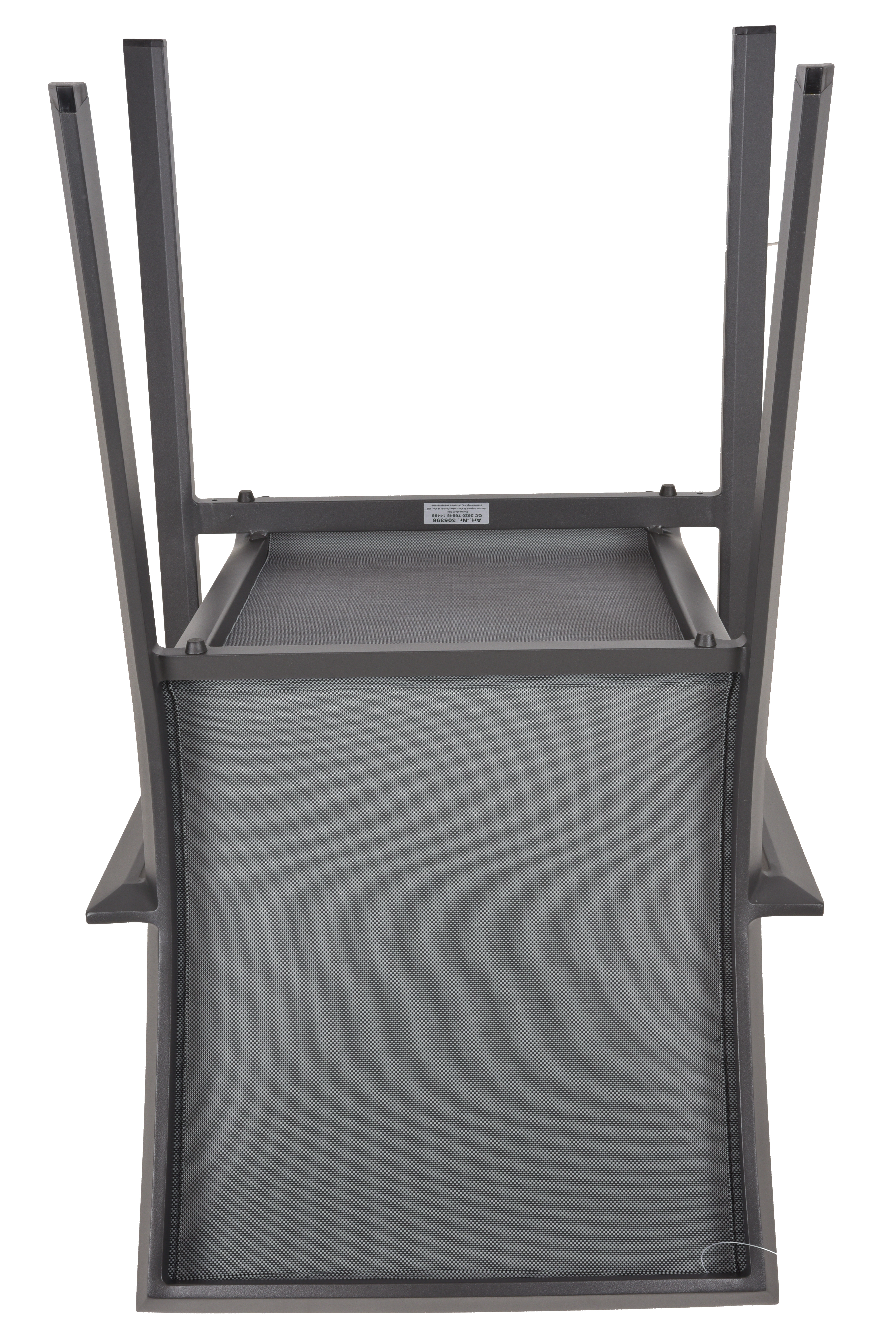 Die vier Stapelstühle RANA passen perfekt zum Tisch. Sie verfügen über einen pulverbeschichteten Alu-Rahmen in dunkelgrauer Farbe und sind mit mittelgrauem Kunststoffgewebe 2x2 bezogen. Diese Stühle sind leicht, stabil und wetterbeständig. Dank ihrer Stapelfunktion können sie platzsparend gelagert werden, wenn sie nicht in Gebrauch sind.