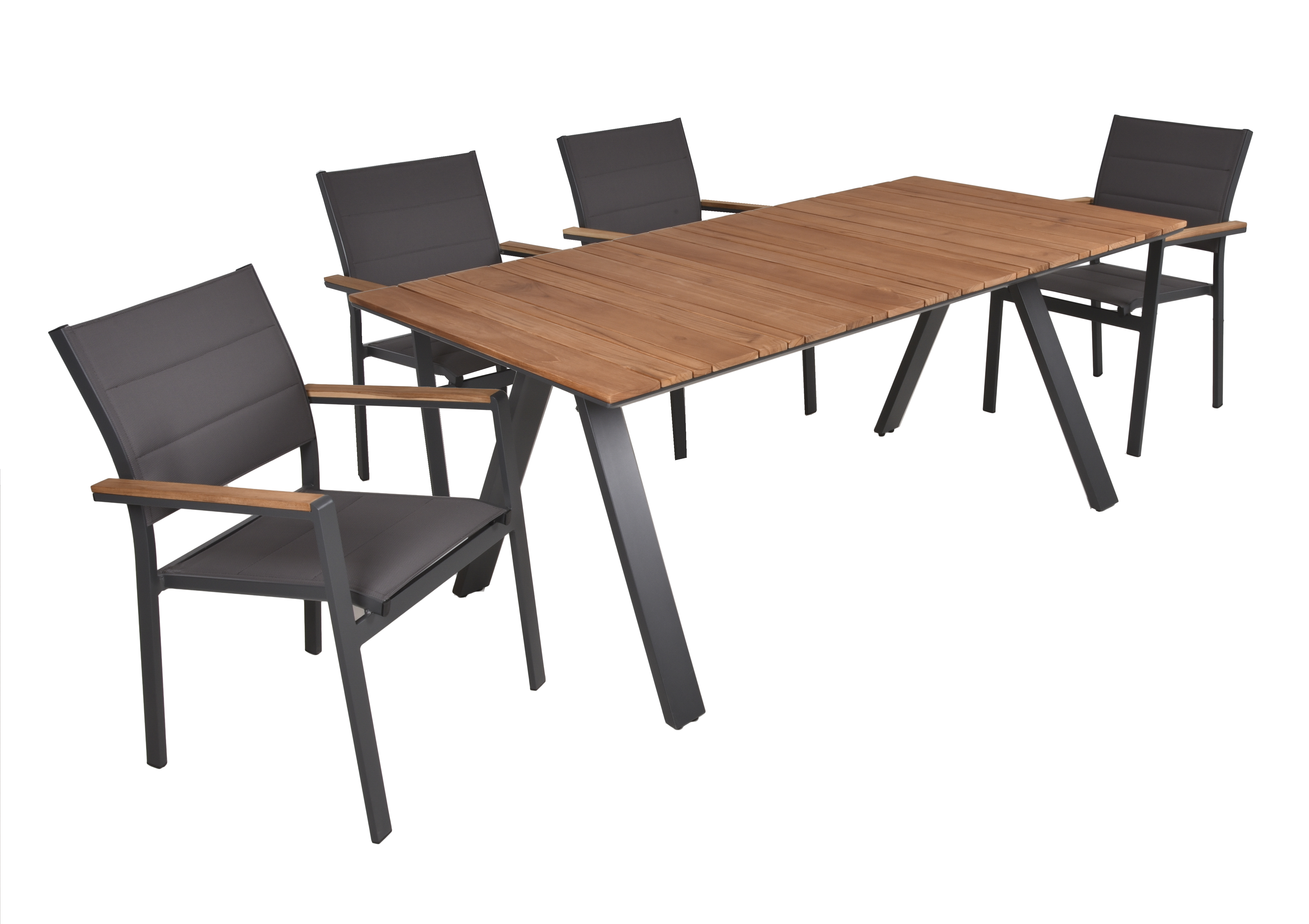 Die Stapelstühle DAVINA bestehen aus anthrazitfarbenem Aluminium, dunkelgrauem Kunststoffgewebe und haben Armlehnen aus FSC-zertifiziertem hellbraunem Teakholz, was ihnen eine stilvolle und langlebige Ausstrahlung verleiht.