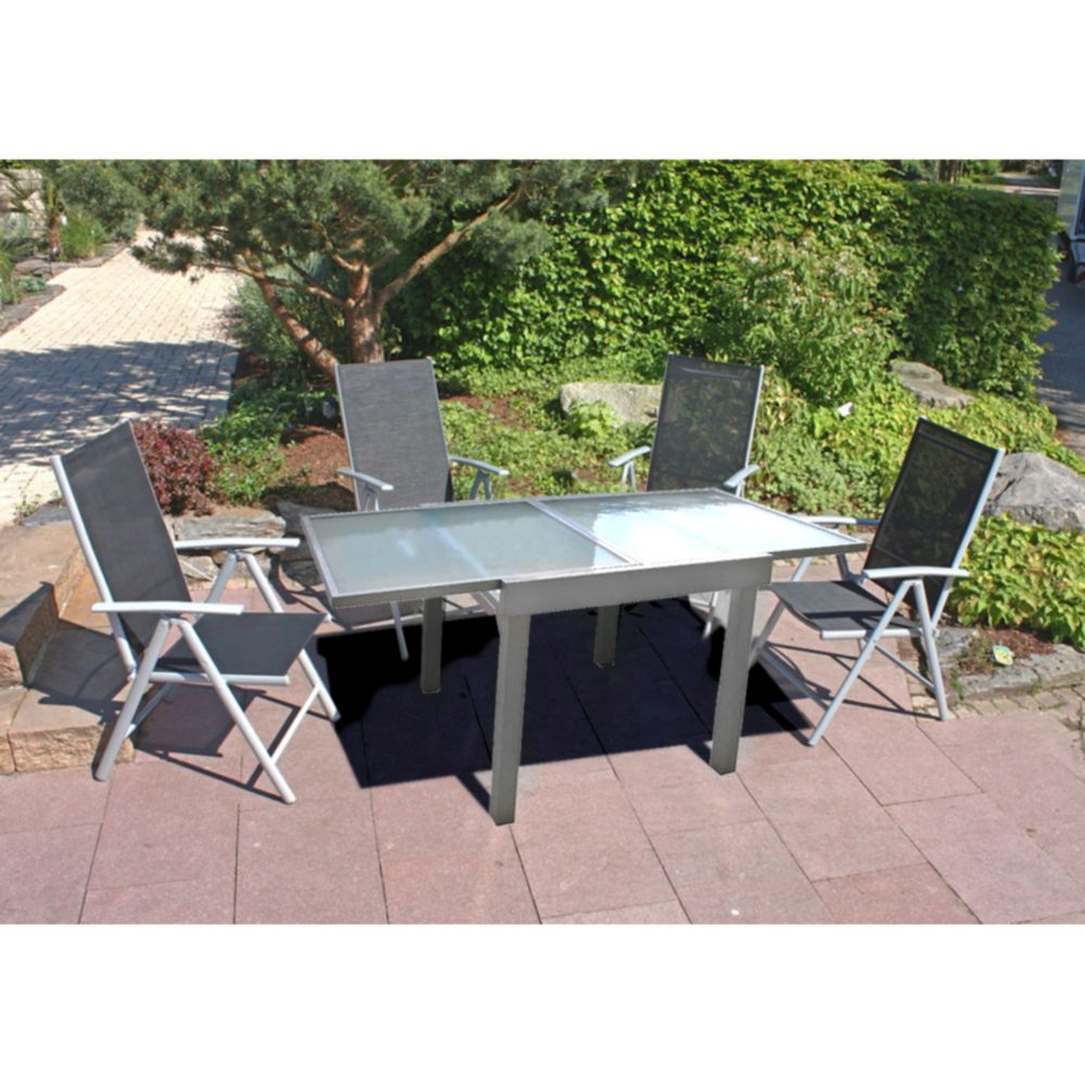 Die Tischgruppe LOLA 5-tlg. ist eine vielseitige und elegante Lösung für Ihren Außenbereich. Dieses Set besteht aus einem Ausziehtisch und vier Hochlehner-Klappstühlen, die alle in einem ansprechenden grauen Farbton pulverbeschichtet sind.