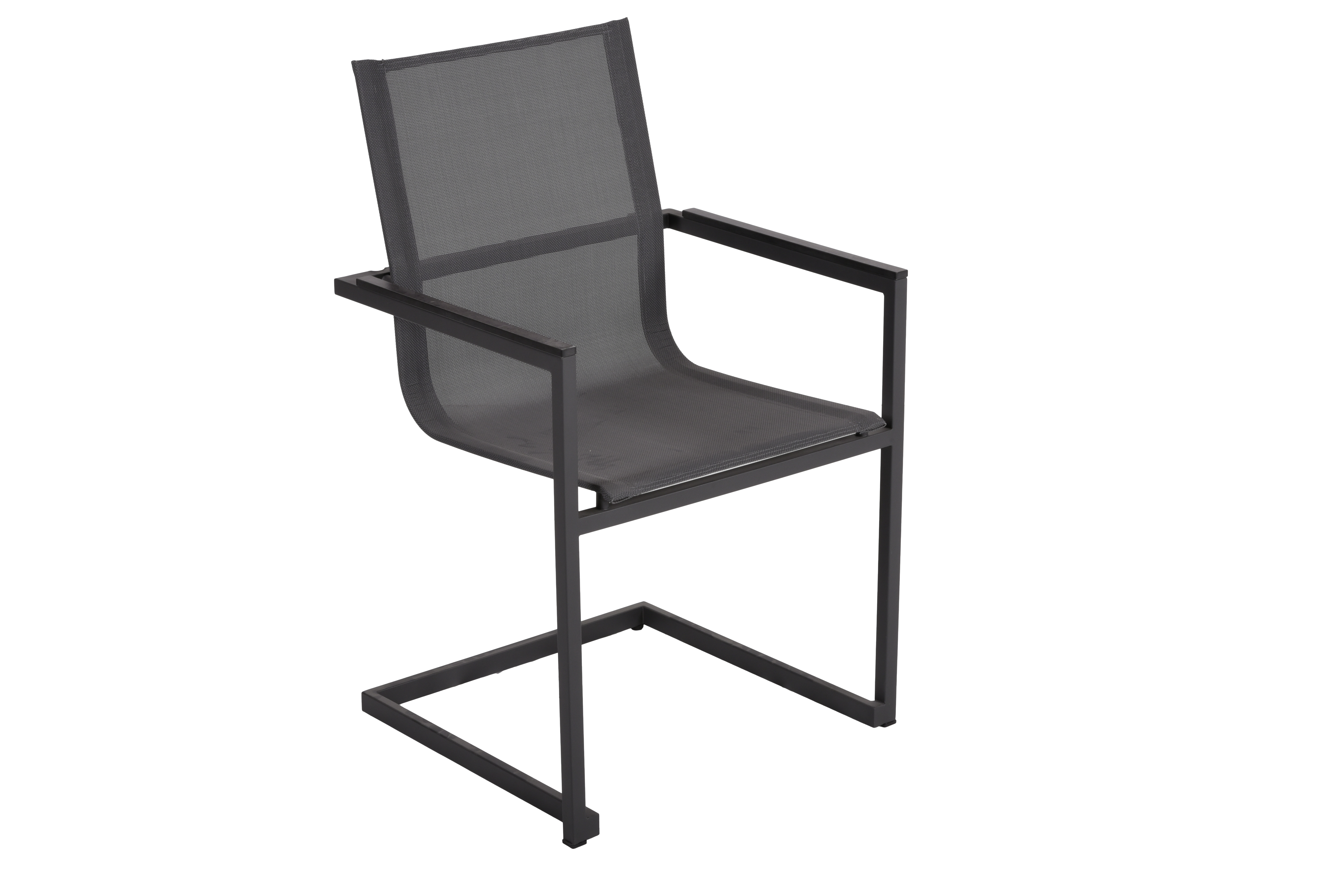 Die acht Freischwinger SOPHIA-Stühle sind aus Edelstahl #304 gefertigt, was für Stabilität und Langlebigkeit sorgt. Die Sitz- und Rückenflächen sind mit anthrazitgrauem Kunststoffgewebe mit einem 2x2-Muster bezogen. Dieses Material ist nicht nur bequem, sondern auch wetterbeständig und pflegeleicht.