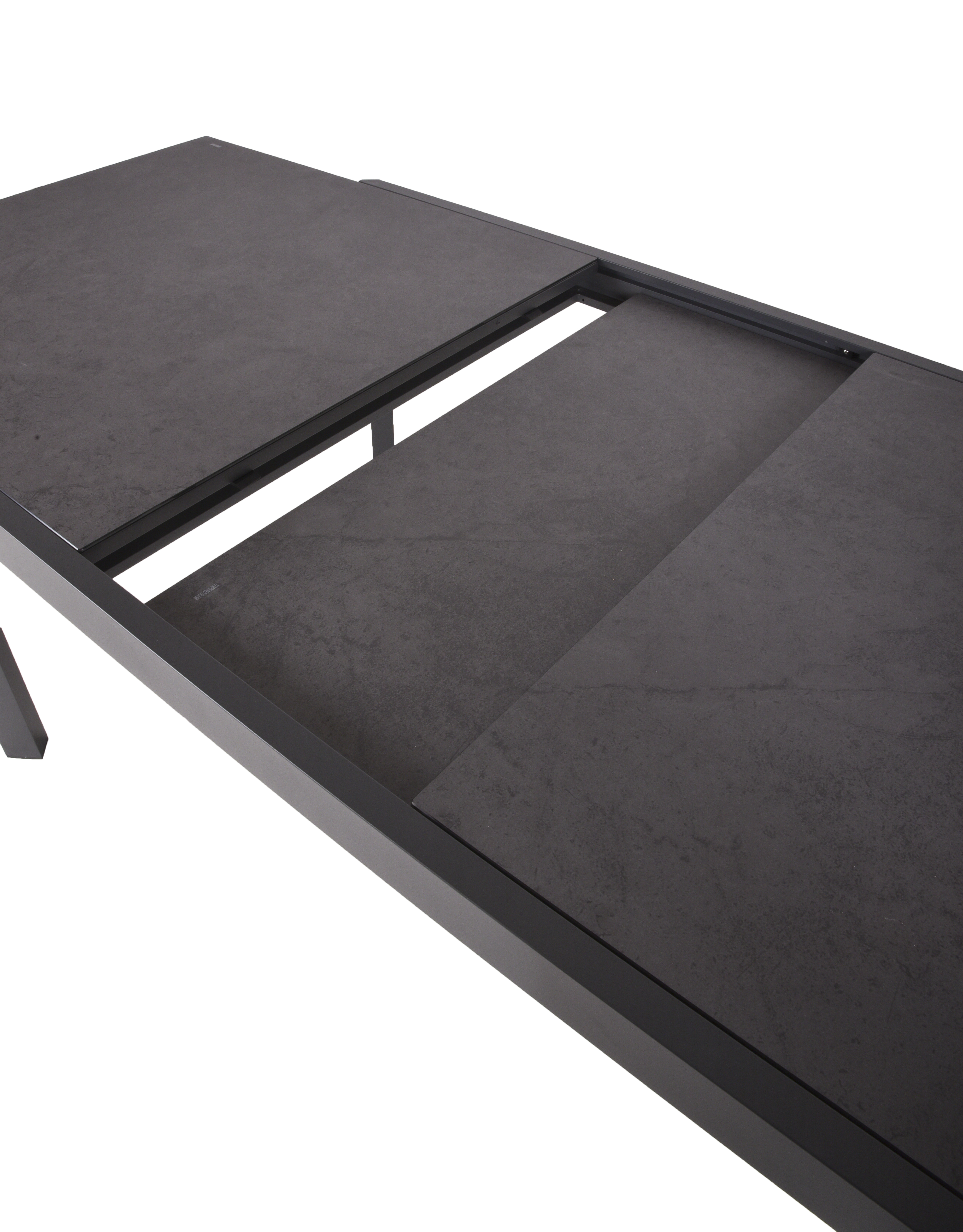 Der Ausziehtisch NEREA verfügt über ein robustes Gestell aus pulverbeschichtetem Anthrazit-Aluminium, was nicht nur für Stabilität, sondern auch für Wetterbeständigkeit sorgt. Die Tischplatte besteht aus Glas in Keramik-Optik, was nicht nur langlebig ist, sondern auch eine elegante Ästhetik bietet. Der Ausziehmechanismus des Tisches, der sich unterhalb der Tischplatte befindet, ermöglicht es Ihnen, die Tischgröße je nach Bedarf anzupassen, um mehr Gäste zu empfangen oder zusätzlichen Raum freizugeben.