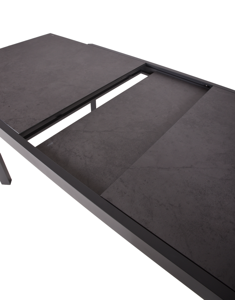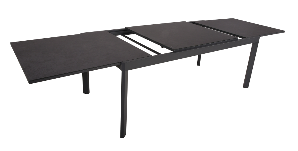 Der Ausziehtisch NEREA verfügt über ein robustes Gestell aus pulverbeschichtetem Anthrazit-Aluminium, was nicht nur für Stabilität, sondern auch für Wetterbeständigkeit sorgt. Die Tischplatte besteht aus Glas in Keramik-Optik, was nicht nur langlebig ist, sondern auch eine elegante Ästhetik bietet. Der Ausziehmechanismus des Tisches, der sich unterhalb der Tischplatte befindet, ermöglicht es Ihnen, die Tischgröße je nach Bedarf anzupassen, um mehr Gäste zu empfangen oder zusätzlichen Raum freizugeben.