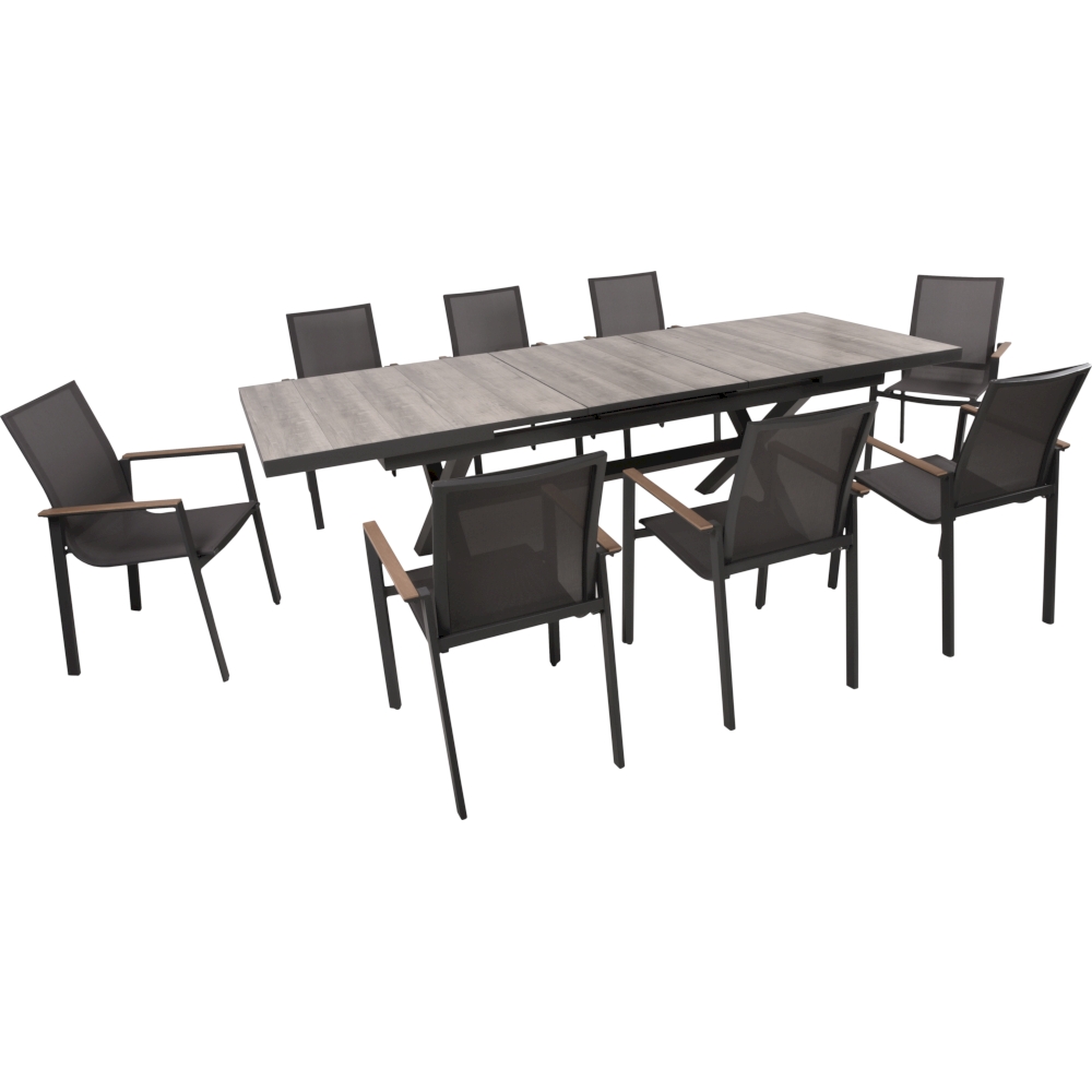 Die acht Stapelstühle SILEA sind mit einem pulverbeschichteten Anthrazit-Aluminiumrahmen ausgestattet und mit dunkelgrauem Polyester bezogen. Die Armlehnen aus natürlichem Nonwood bieten zusätzlichen Komfort und verleihen den Stühlen eine warme, natürliche Note. Die Stapelstühle ermöglichen eine einfache Aufbewahrung und sparen Platz, wenn sie nicht in Gebrauch sind. Dieses Set enthält einen Ausziehtisch und acht Stühle und ist perfekt für gesellige Abende im Freien mit Familie und Freunden geeignet.